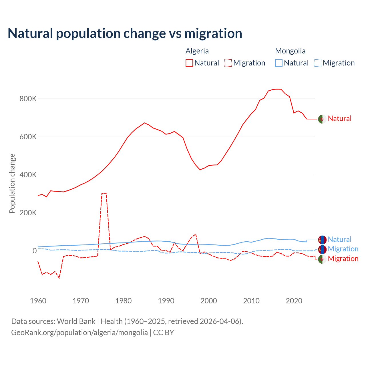 Over the last 10 years, 97.6% of the population change in Algeria is from natural causes (a gain of 7,892,580 people) and 2.42% is from migration (a loss of 195,723 people). In Mongolia 94.1% is from natural causes (a gain of 580,367 people) and 5.87% is from migration (a gain of 36,163 people).