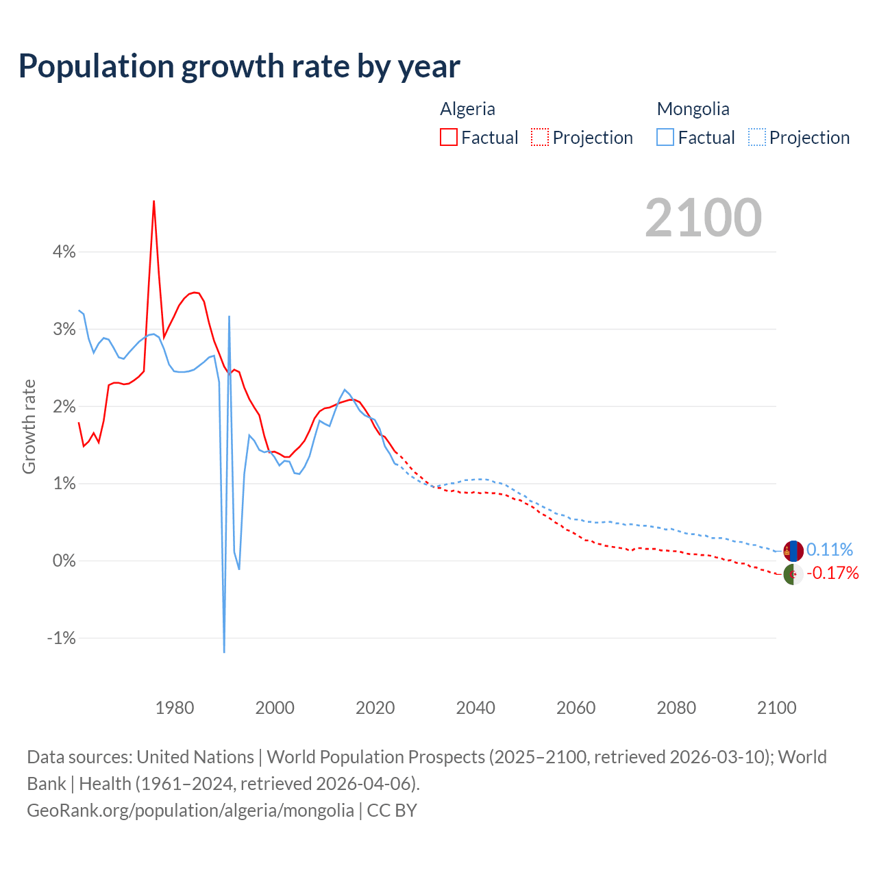 - For the last 10 years, Algeria has had an average growth rate of +1.81% per year vs +1.79% in Mongolia.