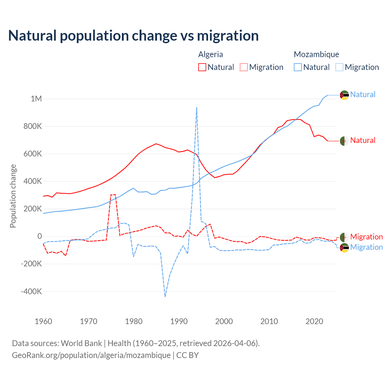 Over the last 10 years, 97.6% of the population change in Algeria is from natural causes (a gain of 7,892,580 people) and 2.42% is from migration (a loss of 195,723 people). In Mozambique 95.9% is from natural causes (a gain of 9,108,203 people) and 4.15% is from migration (a loss of 393,923 people).