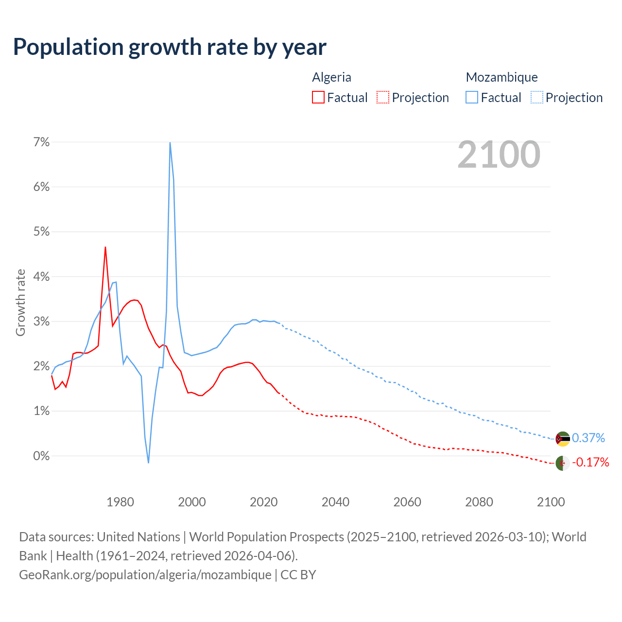 - For the last 10 years, Algeria has had an average growth rate of +1.81% per year vs +2.99% in Mozambique.