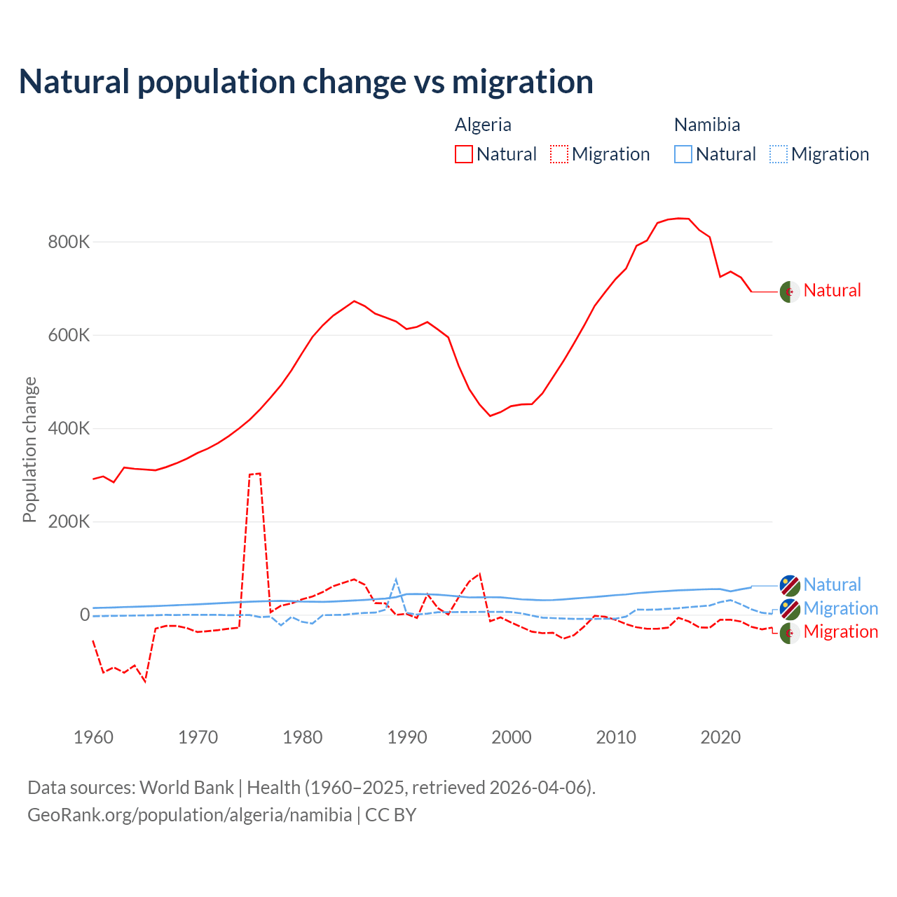 Over the last 10 years, 97.6% of the population change in Algeria is from natural causes (a gain of 7,892,580 people) and 2.42% is from migration (a loss of 195,723 people). In Namibia 74.3% is from natural causes (a gain of 532,532 people) and 25.7% is from migration (a gain of 183,837 people).