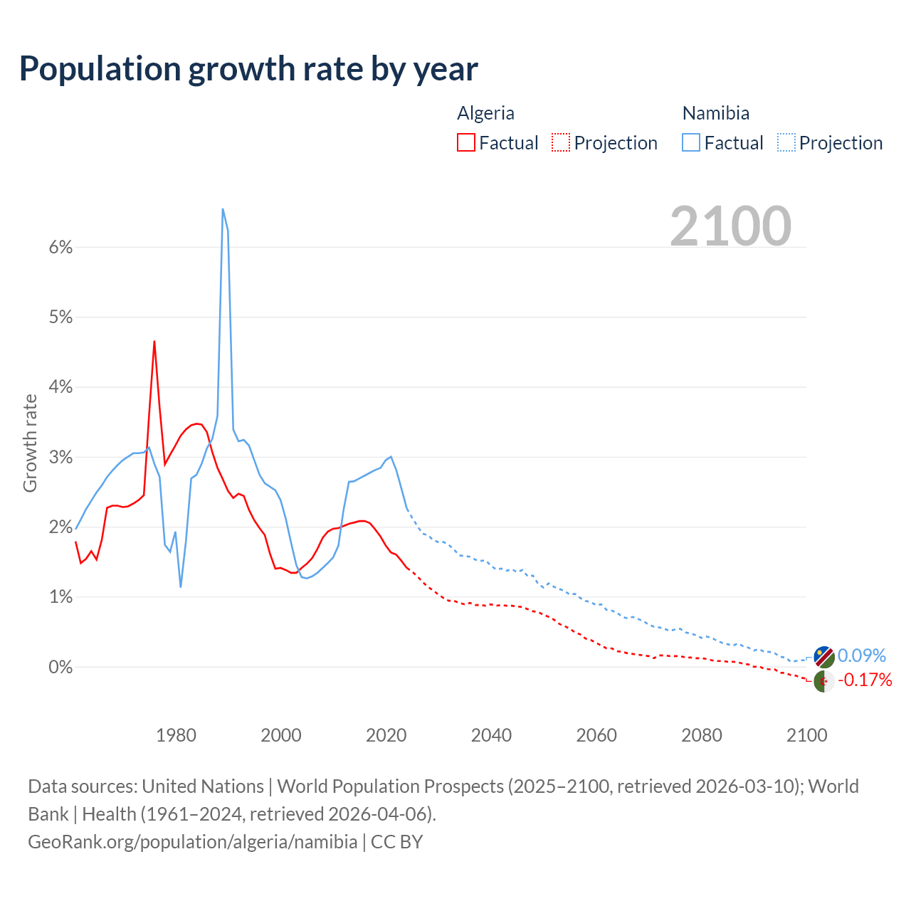 - For the last 10 years, Algeria has had an average growth rate of +1.81% per year vs +2.73% in Namibia.