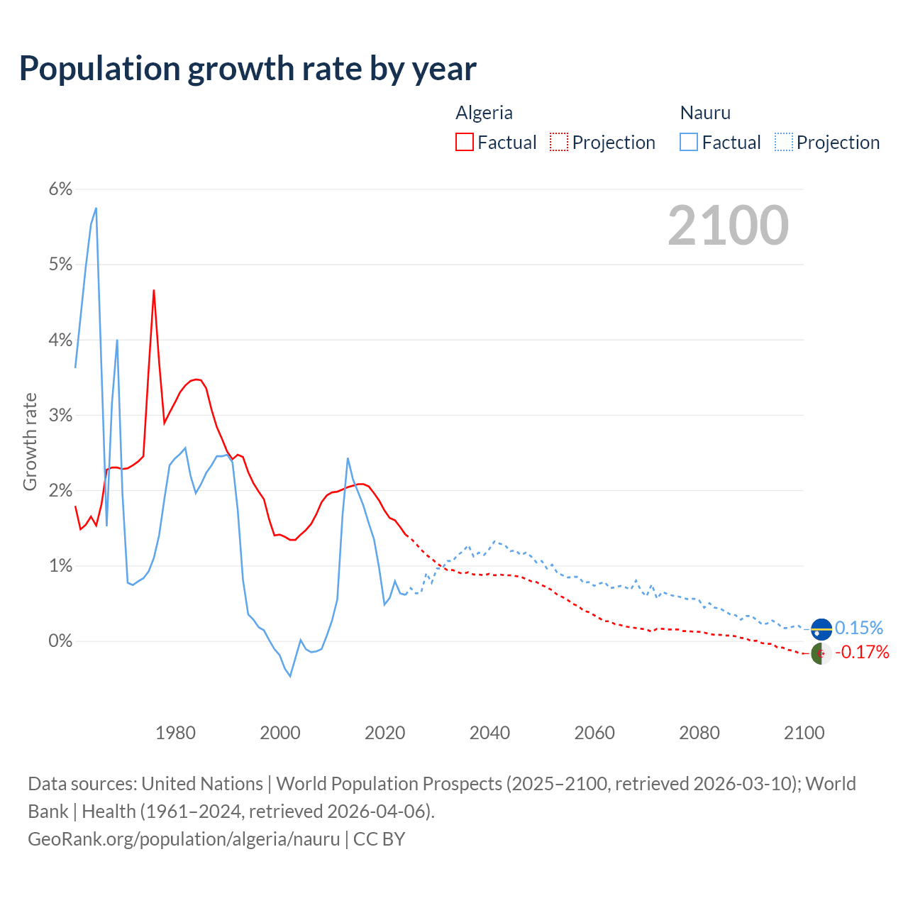 - For the last 10 years, Algeria has had an average growth rate of +1.81% per year vs +1.17% in Nauru.