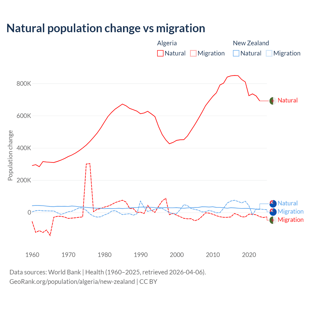 Over the last 10 years, 97.6% of the population change in Algeria is from natural causes (a gain of 7,892,580 people) and 2.42% is from migration (a loss of 195,723 people). In New Zealand 34.4% is from natural causes (a gain of 247,767 people) and 65.6% is from migration (a gain of 471,602 people).
