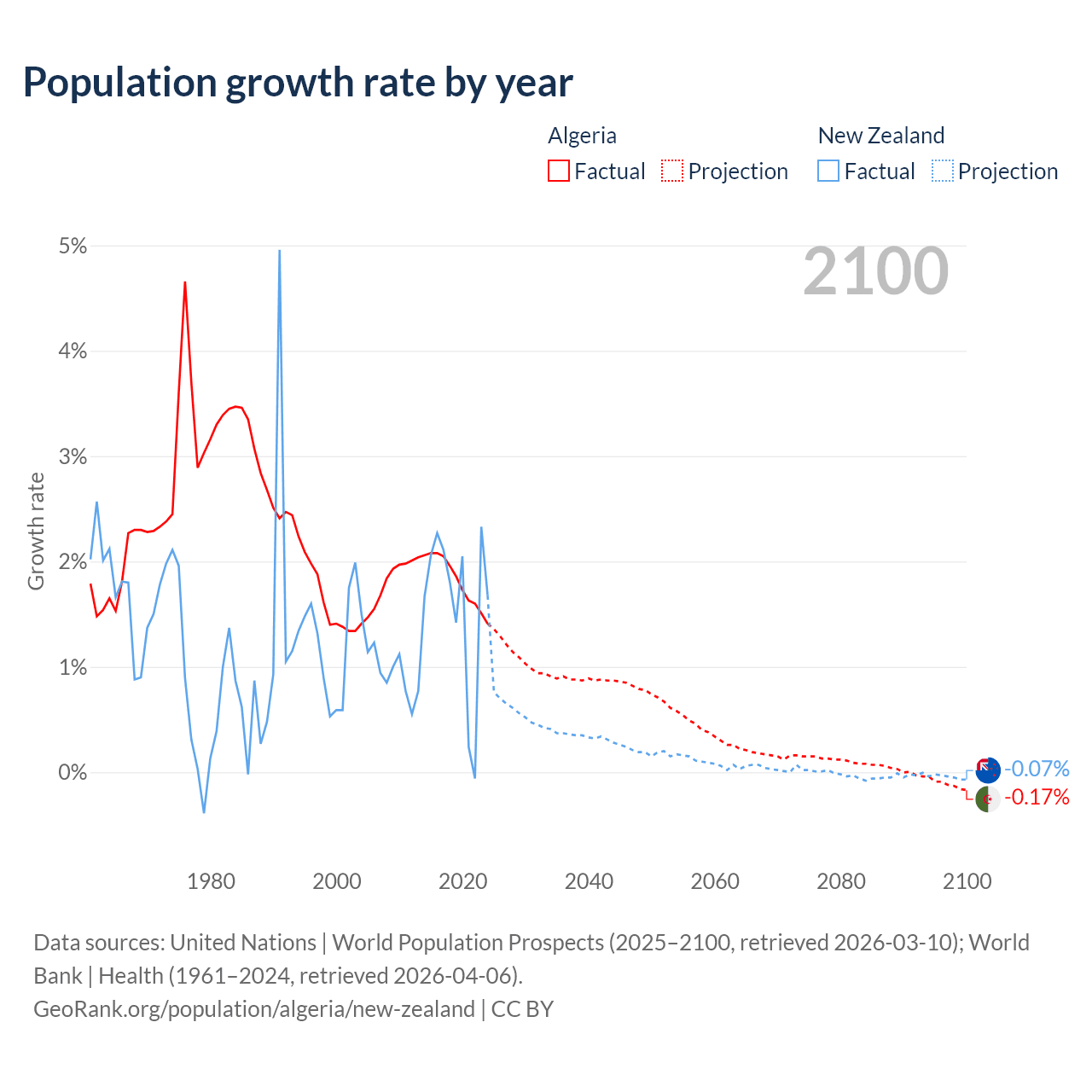 - For the last 10 years, Algeria has had an average growth rate of +1.81% per year vs +1.6% in New Zealand.
