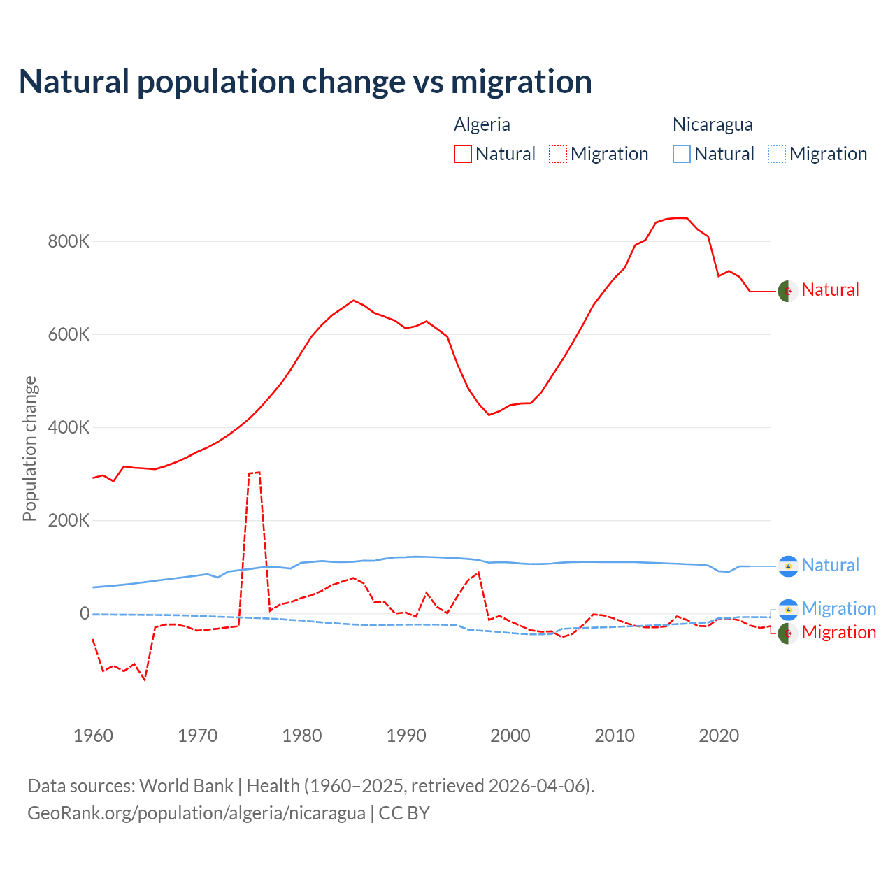 Over the last 10 years, 97.6% of the population change in Algeria is from natural causes (a gain of 7,892,580 people) and 2.42% is from migration (a loss of 195,723 people). In Nicaragua 85.5% is from natural causes (a gain of 1,017,084 people) and 14.5% is from migration (a loss of 172,078 people).