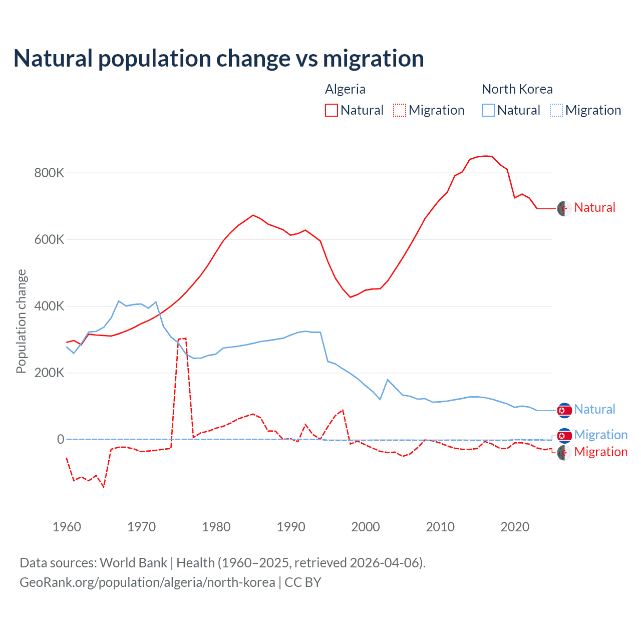 Over the last 10 years, 97.6% of the population change in Algeria is from natural causes (a gain of 7,892,580 people) and 2.42% is from migration (a loss of 195,723 people). In North Korea 97.7% is from natural causes (a gain of 1,097,372 people) and 2.33% is from migration (a loss of 26,227 people).