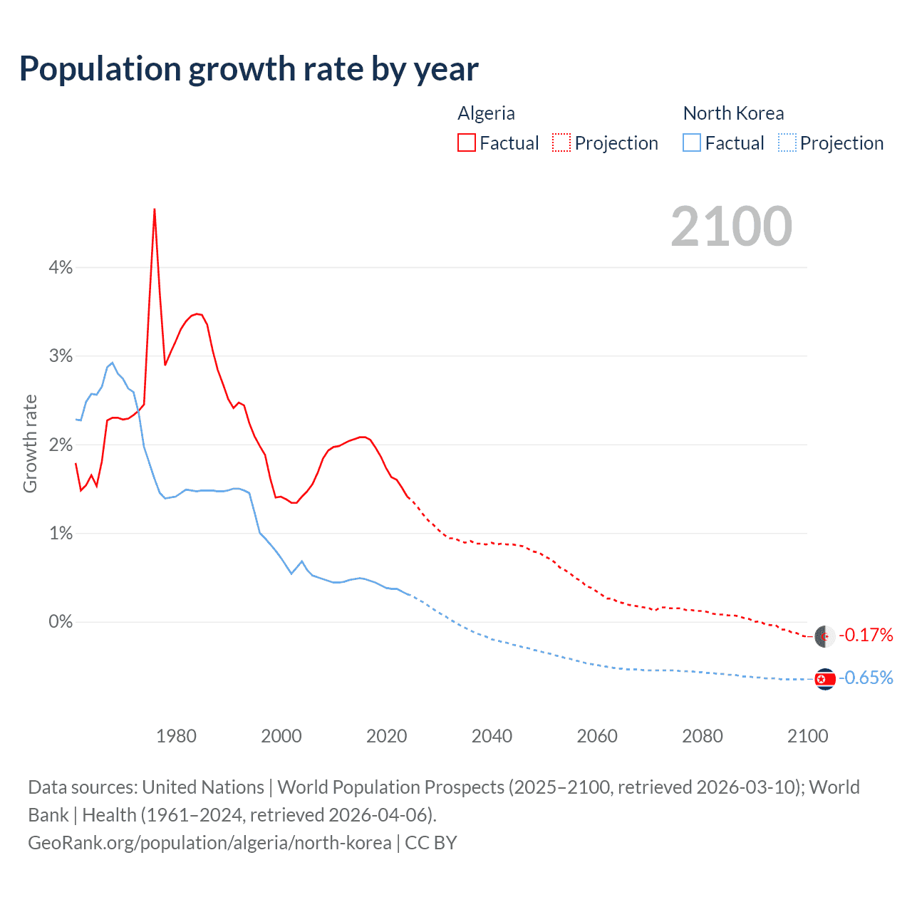 - For the last 10 years, Algeria has had an average growth rate of +1.81% per year vs +0.41% in North Korea.