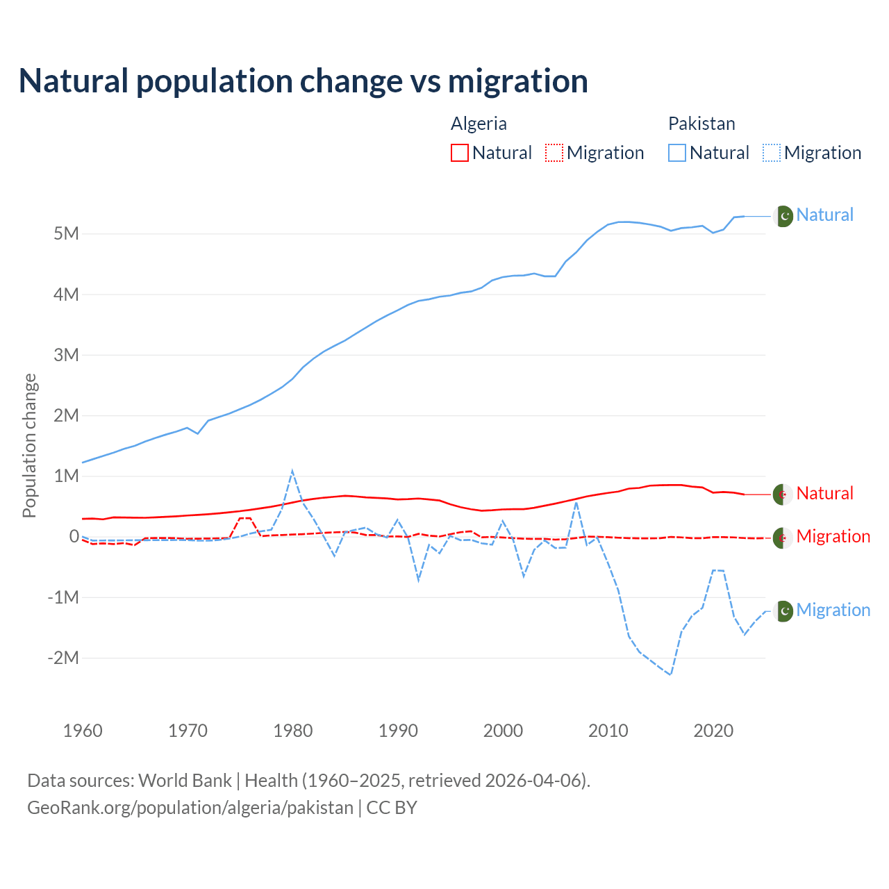Over the last 10 years, 97.6% of the population change in Algeria is from natural causes (a gain of 7,892,580 people) and 2.42% is from migration (a loss of 195,723 people). In Pakistan 77.8% is from natural causes (a gain of 51,255,404 people) and 22.2% is from migration (a loss of 14,629,055 people).