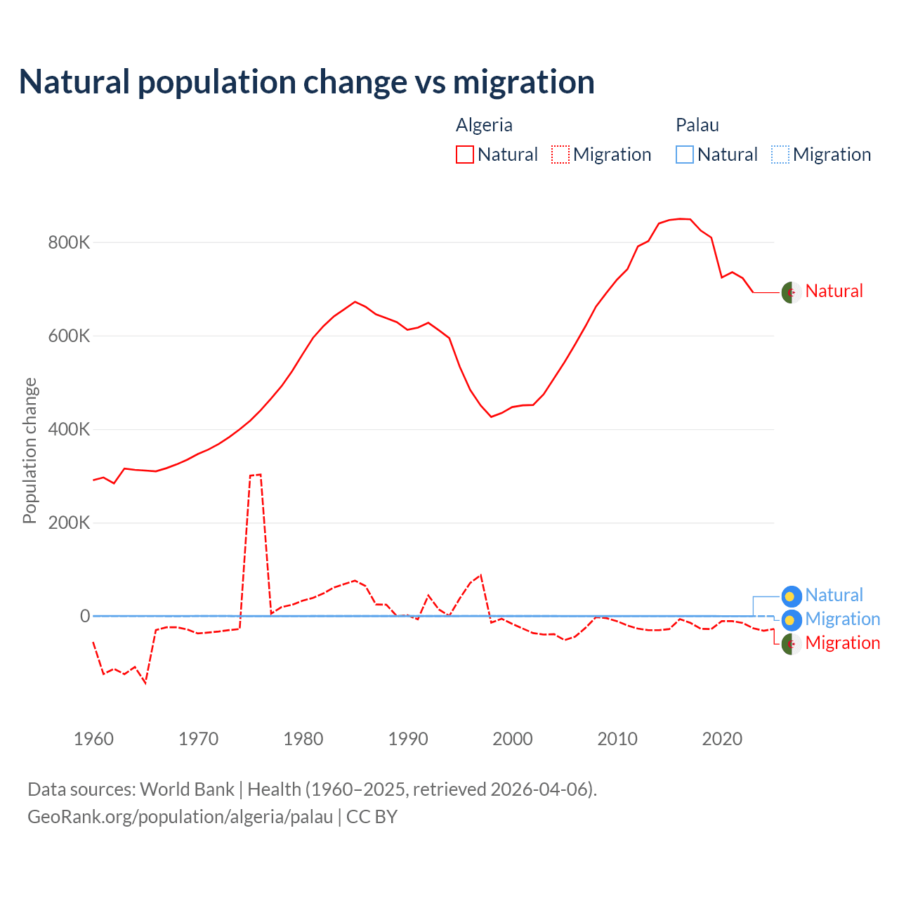 Over the last 10 years, 97.6% of the population change in Algeria is from natural causes (a gain of 7,892,580 people) and 2.42% is from migration (a loss of 195,723 people). In Palau 53.8% is from natural causes (a gain of 264 people) and 46.2% is from migration (a loss of 227 people).