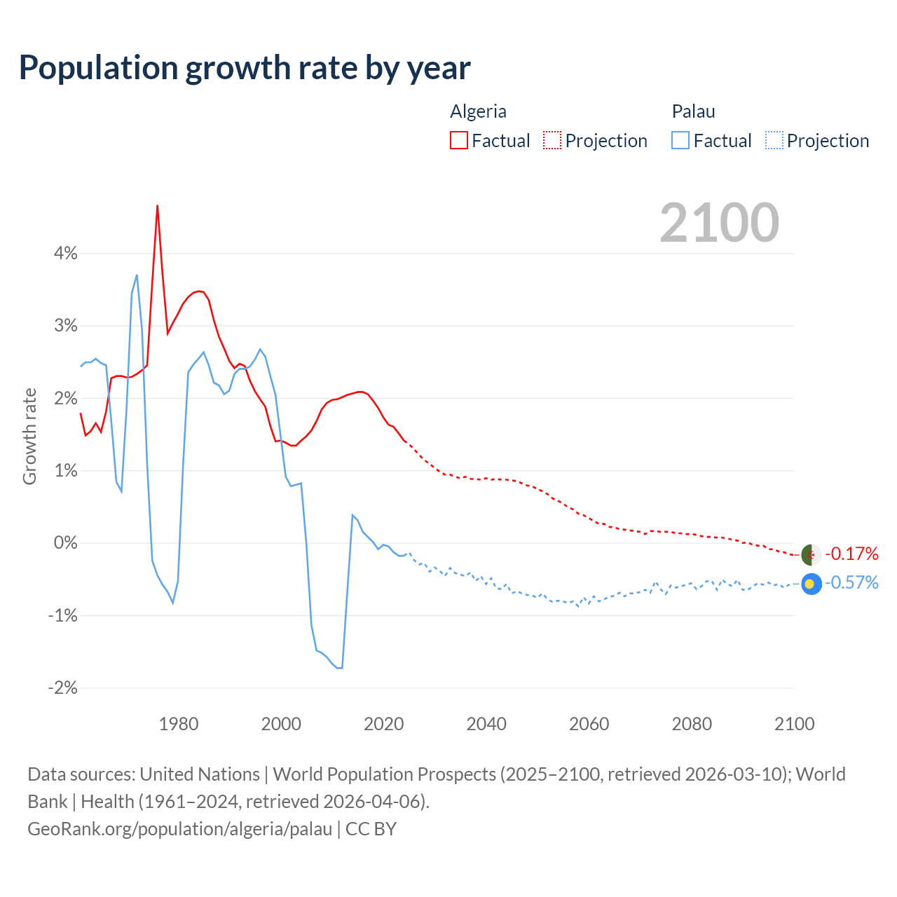 - For the last 10 years, Algeria has had an average growth rate of +1.81% per year vs +0.02% in Palau.