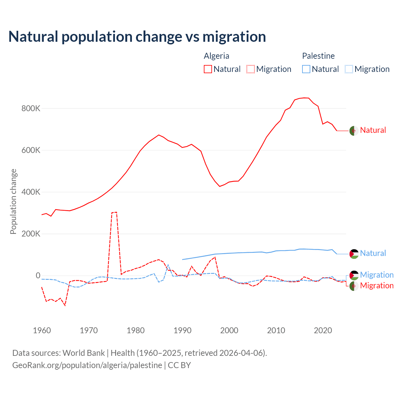Over the last 10 years, 97.6% of the population change in Algeria is from natural causes (a gain of 7,892,580 people) and 2.42% is from migration (a loss of 195,723 people). In Palestine 85.7% is from natural causes (a gain of 1,218,010 people) and 14.3% is from migration (a loss of 202,820 people).