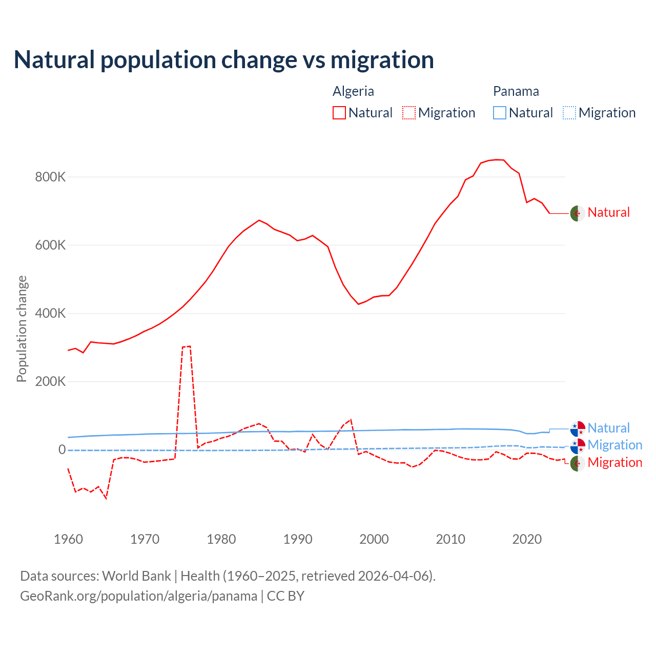Over the last 10 years, 97.6% of the population change in Algeria is from natural causes (a gain of 7,892,580 people) and 2.42% is from migration (a loss of 195,723 people). In Panama 86.5% is from natural causes (a gain of 544,211 people) and 13.5% is from migration (a gain of 84,849 people).