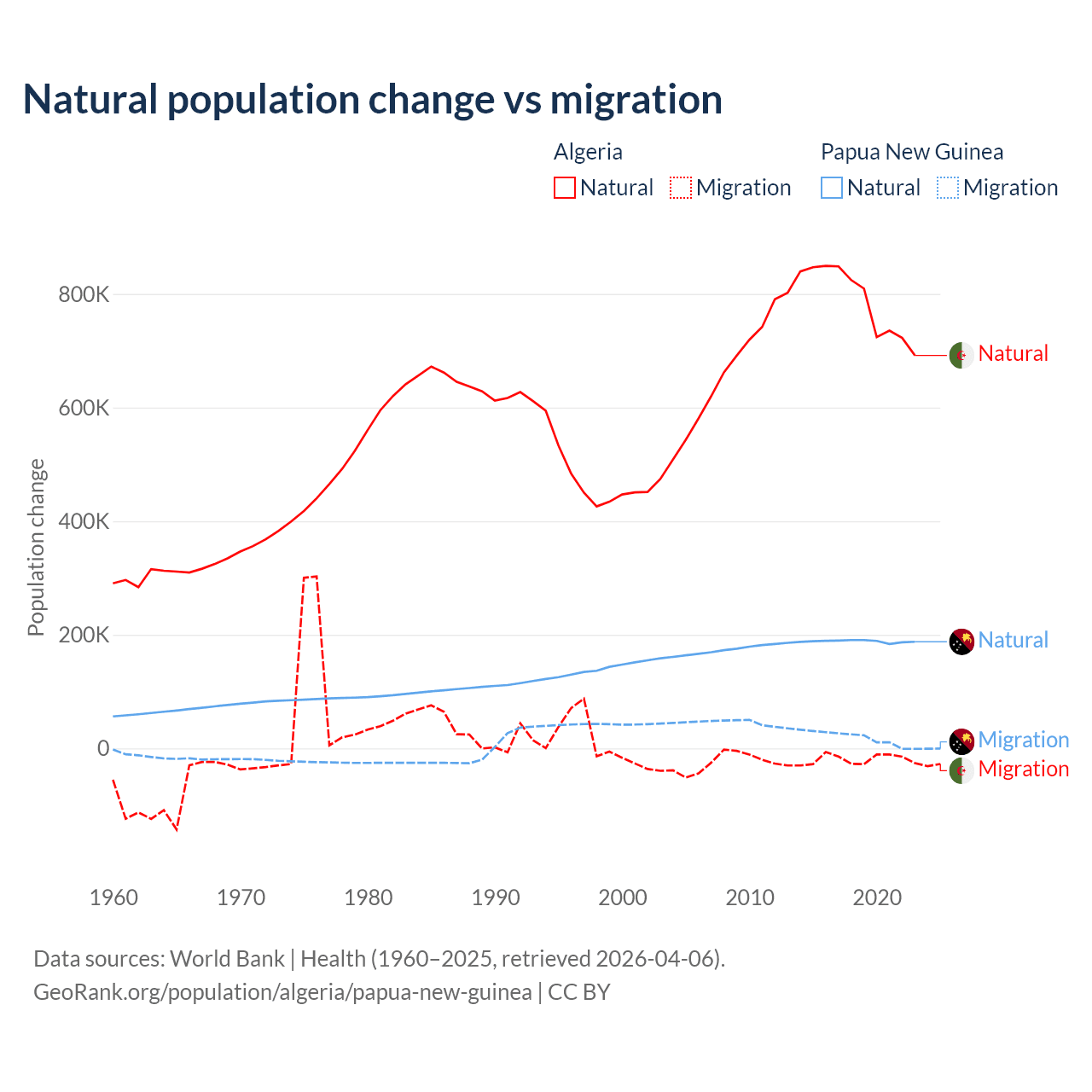 Over the last 10 years, 97.6% of the population change in Algeria is from natural causes (a gain of 7,892,580 people) and 2.42% is from migration (a loss of 195,723 people). In Papua New Guinea 91% is from natural causes (a gain of 1,883,906 people) and 8.98% is from migration (a gain of 185,900 people).