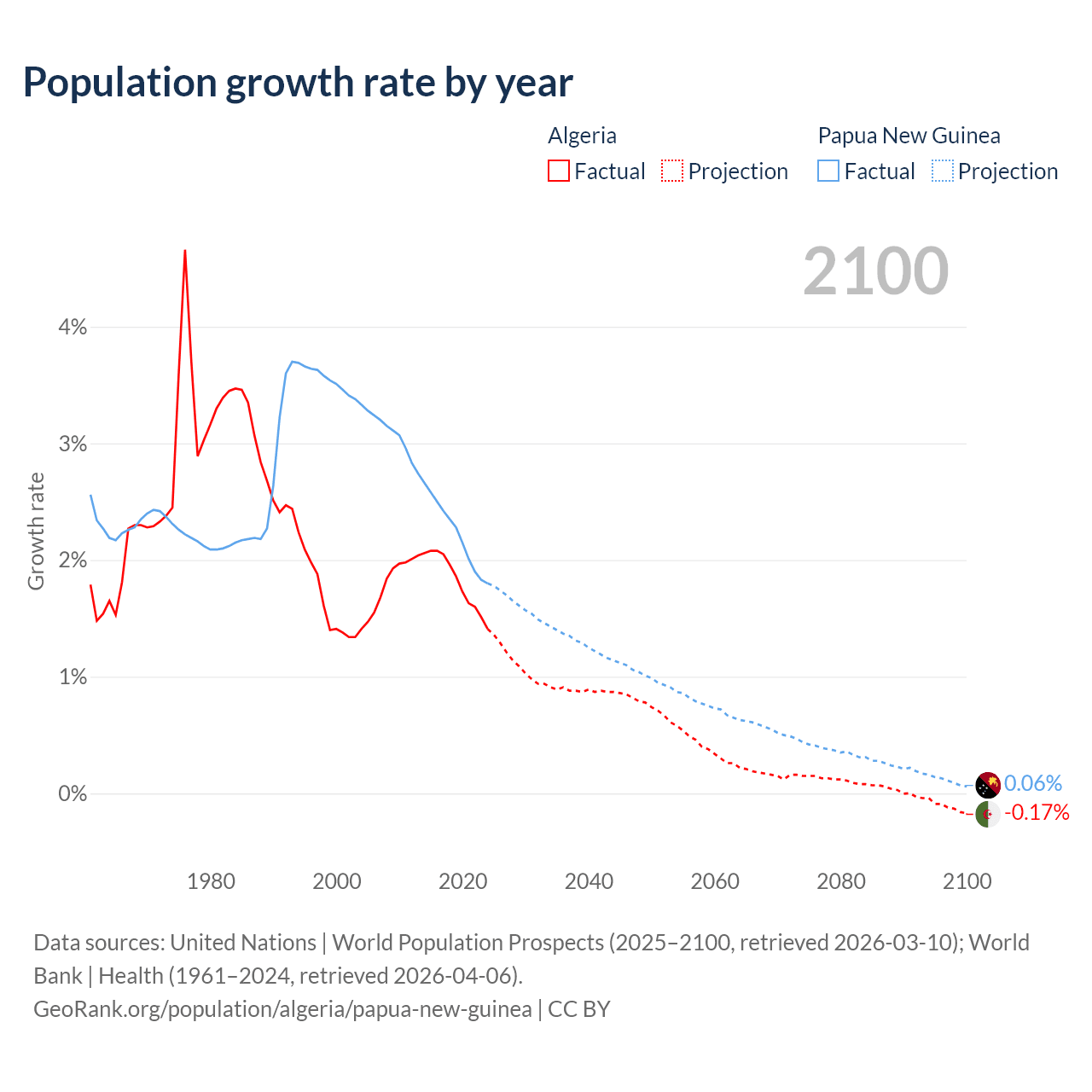 - For the last 10 years, Algeria has had an average growth rate of +1.81% per year vs +2.23% in Papua New Guinea.