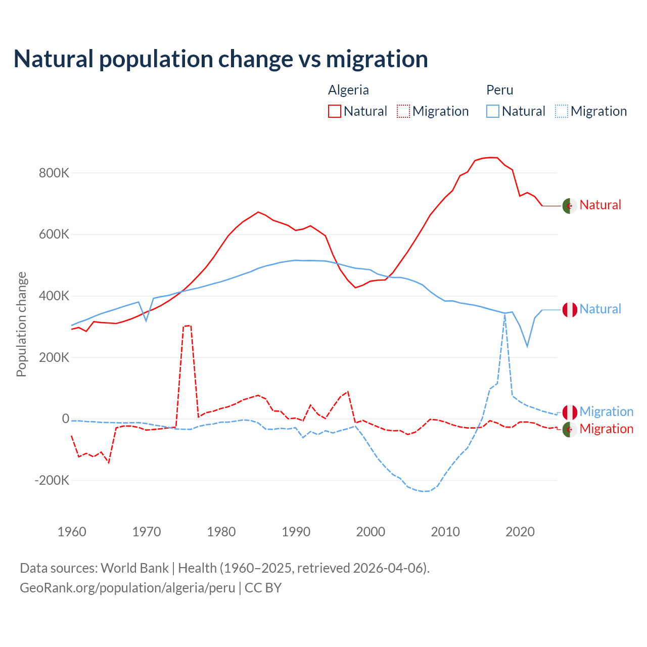 Over the last 10 years, 97.6% of the population change in Algeria is from natural causes (a gain of 7,892,580 people) and 2.42% is from migration (a loss of 195,723 people). In Peru 82% is from natural causes (a gain of 3,345,822 people) and 18% is from migration (a gain of 732,505 people).