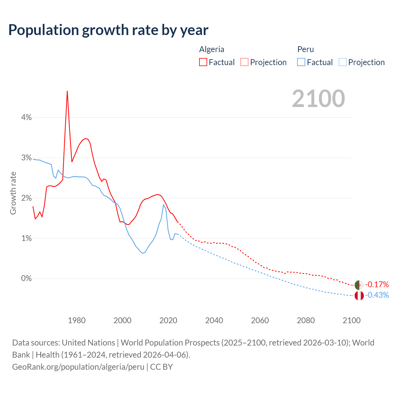 - For the last 10 years, Algeria has had an average growth rate of +1.81% per year vs +1.26% in Peru.