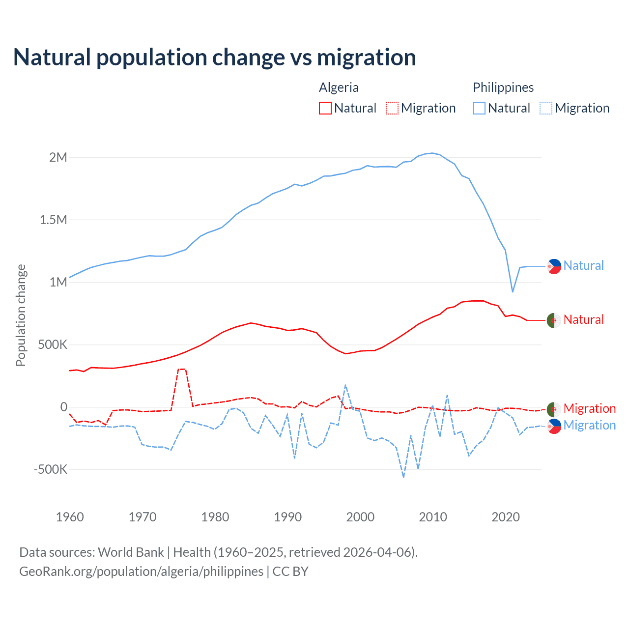 Over the last 10 years, 97.6% of the population change in Algeria is from natural causes (a gain of 7,892,580 people) and 2.42% is from migration (a loss of 195,723 people). In the Philippines 88.5% is from natural causes (a gain of 14,279,705 people) and 11.5% is from migration (a loss of 1,848,117 people).