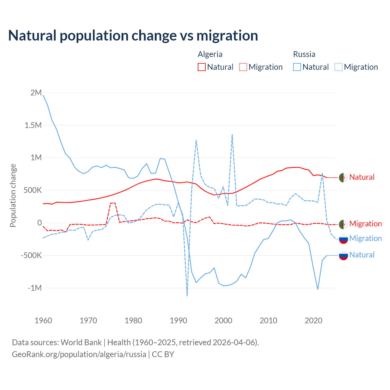 Over the last 10 years, 97.6% of the population change in Algeria is from natural causes (a gain of 7,892,580 people) and 2.42% is from migration (a loss of 195,723 people). In Russia 48.6% is from natural causes (a loss of 3,416,377 people) and 51.4% is from migration (a gain of 3,611,826 people).