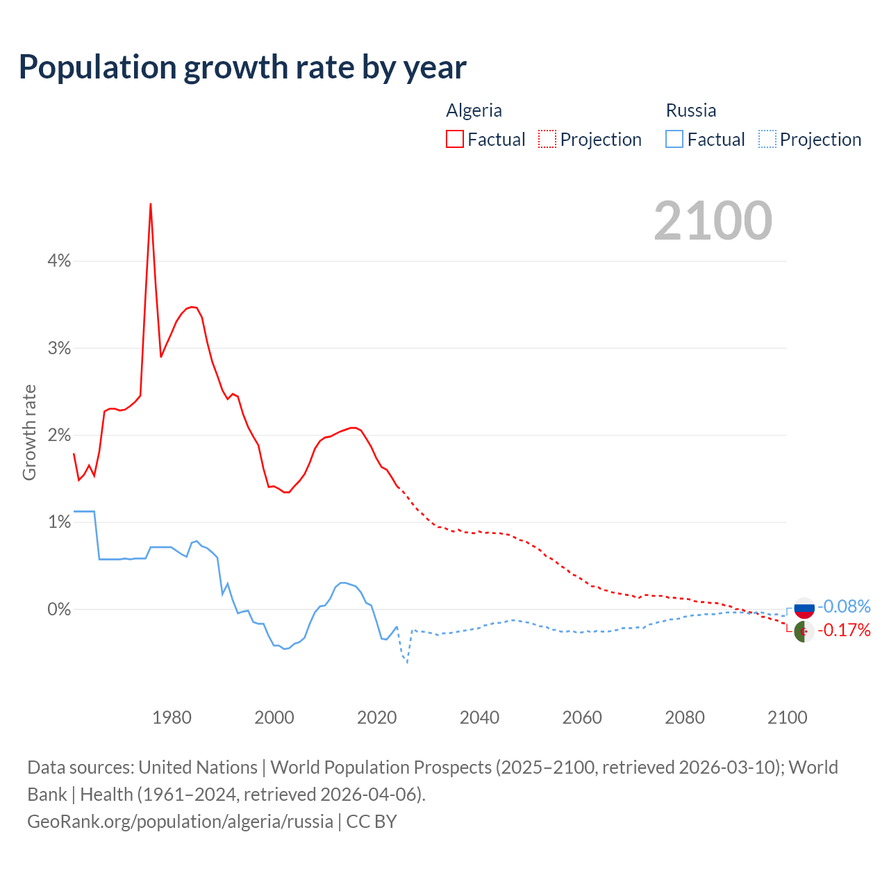 - For the last 10 years, Algeria has had an average growth rate of +1.81% per year vs -0.02% in Russia.