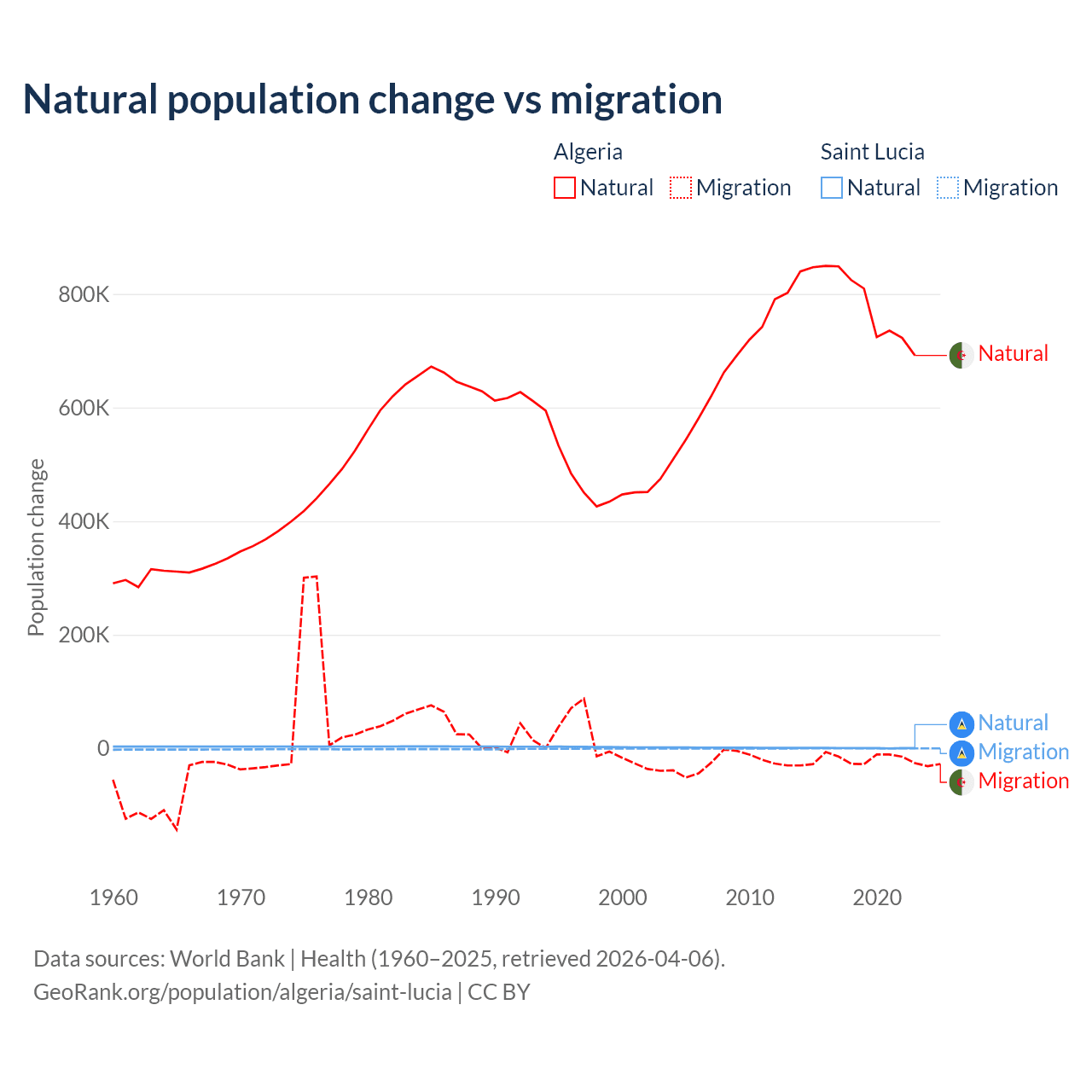 Over the last 10 years, 97.6% of the population change in Algeria is from natural causes (a gain of 7,892,580 people) and 2.42% is from migration (a loss of 195,723 people). In Saint Lucia 95.7% is from natural causes (a gain of 6,039 people) and 4.31% is from migration (a loss of 272 people).