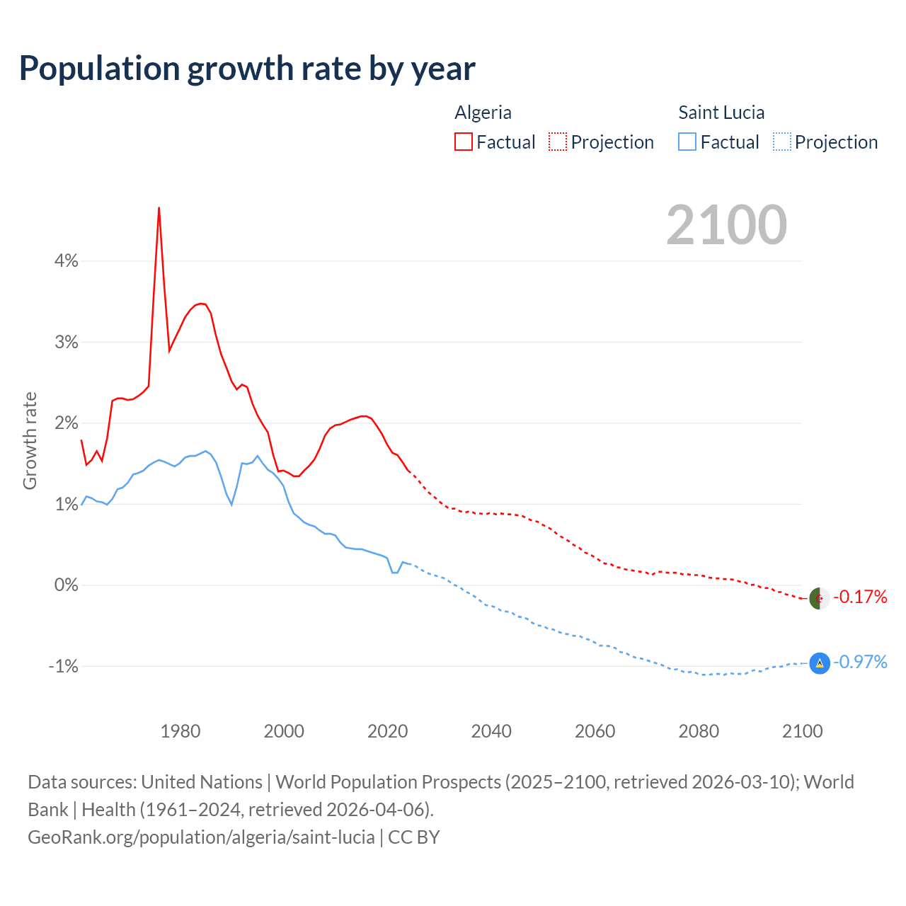 - For the last 10 years, Algeria has had an average growth rate of +1.81% per year vs +0.33% in Saint Lucia.