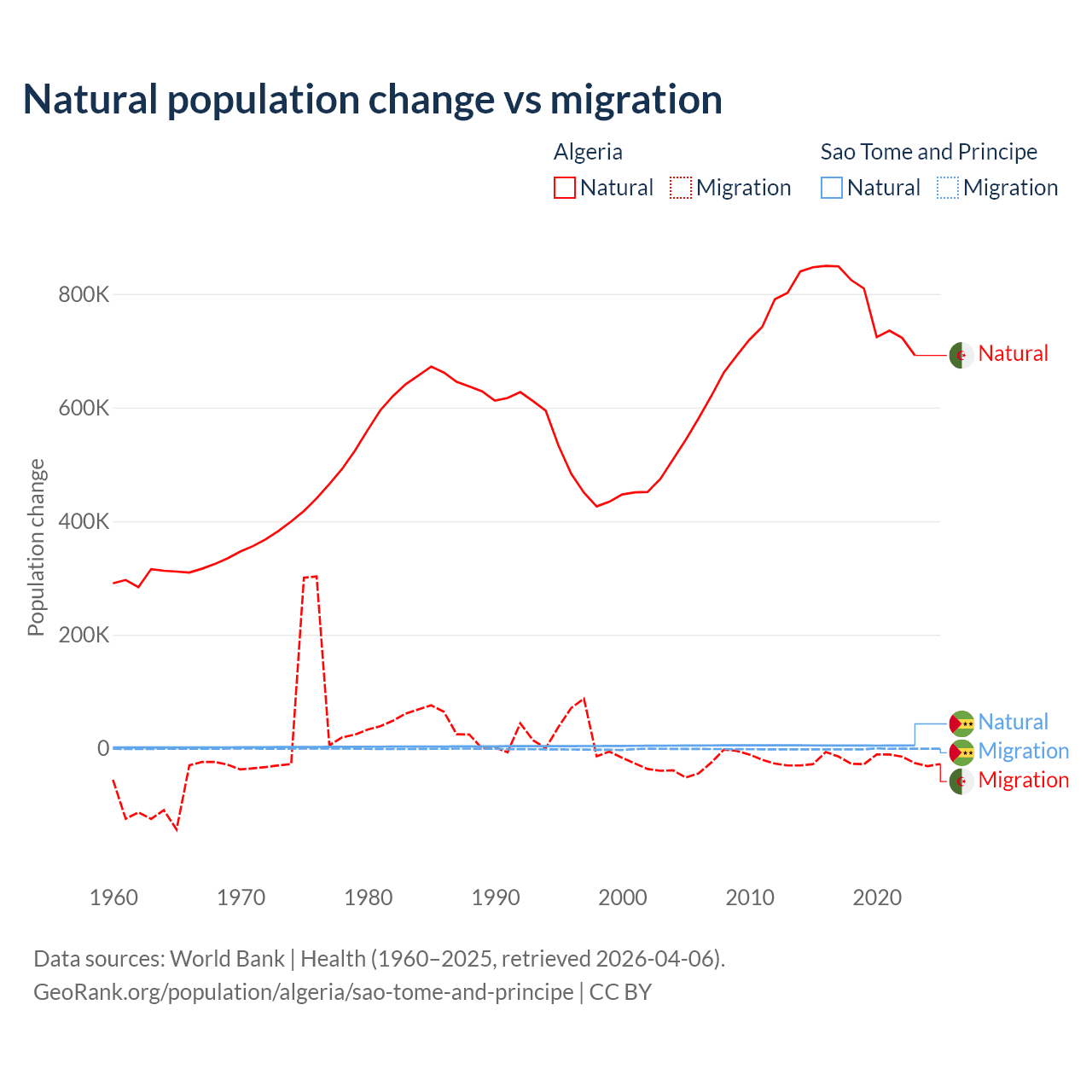 Over the last 10 years, 97.6% of the population change in Algeria is from natural causes (a gain of 7,892,580 people) and 2.42% is from migration (a loss of 195,723 people). In Sao Tome and Principe 80.1% is from natural causes (a gain of 50,822 people) and 19.9% is from migration (a loss of 12,621 people).