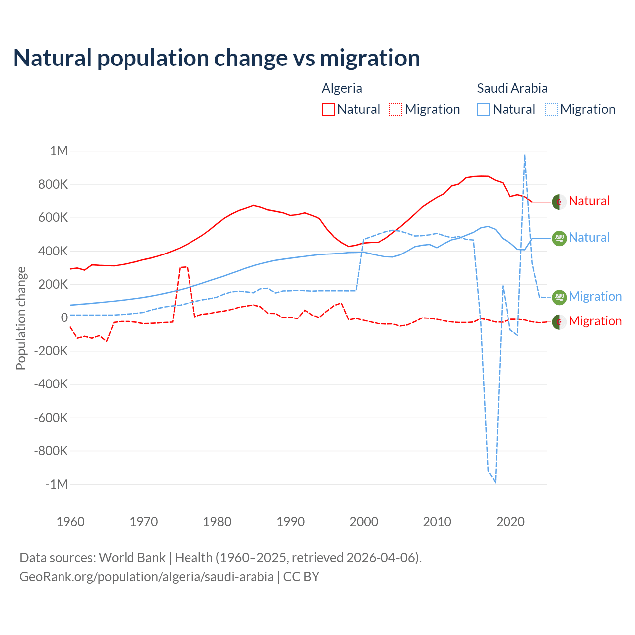 Over the last 10 years, 97.6% of the population change in Algeria is from natural causes (a gain of 7,892,580 people) and 2.42% is from migration (a loss of 195,723 people). In Saudi Arabia 93.9% is from natural causes (a gain of 4,829,562 people) and 6.05% is from migration (a gain of 311,209 people).