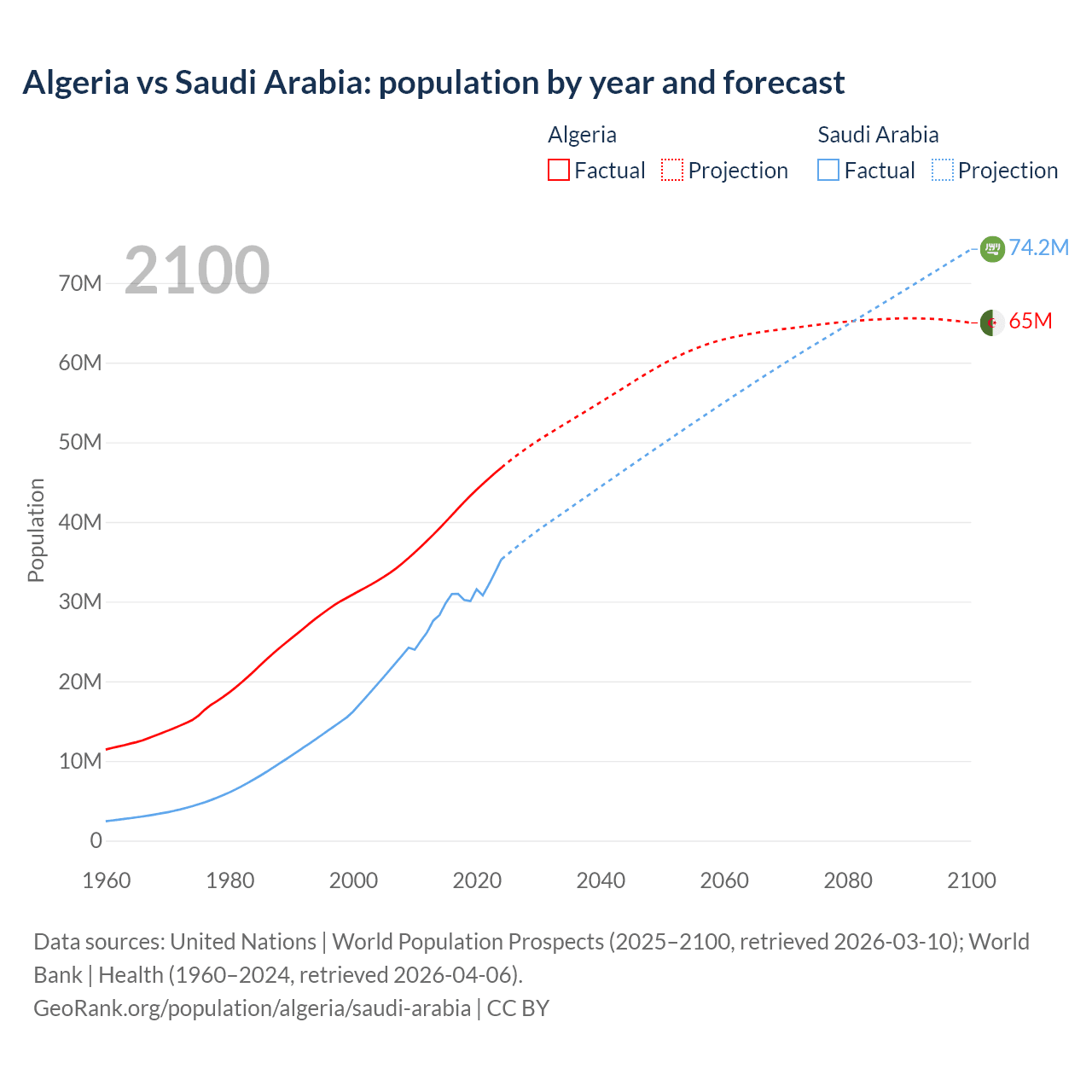 Algeria vs Saudi Arabia: population by year and forecast