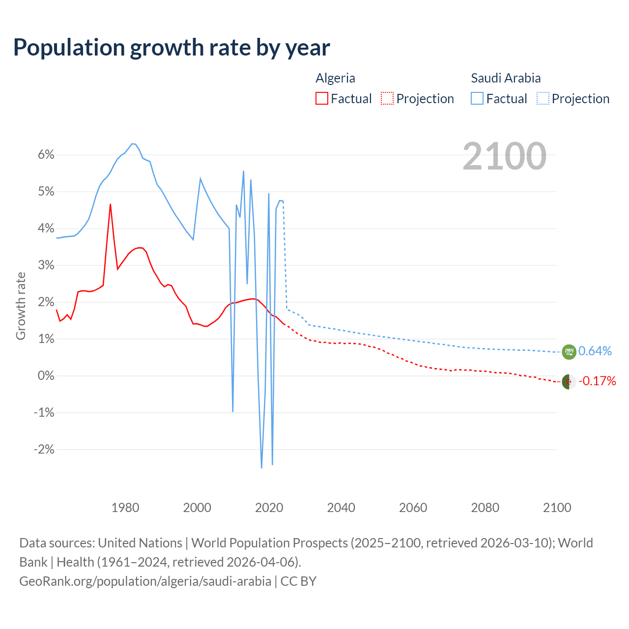 - For the last 10 years, Algeria has had an average growth rate of +1.81% per year vs +2.3% in Saudi Arabia.