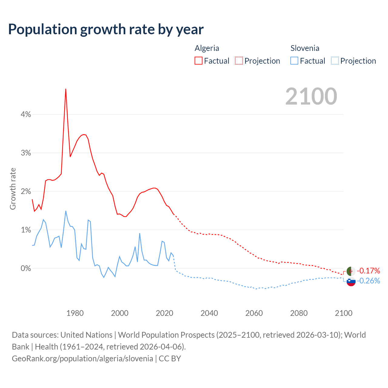 - For the last 10 years, Algeria has had an average growth rate of +1.81% per year vs +0.29% in Slovenia.