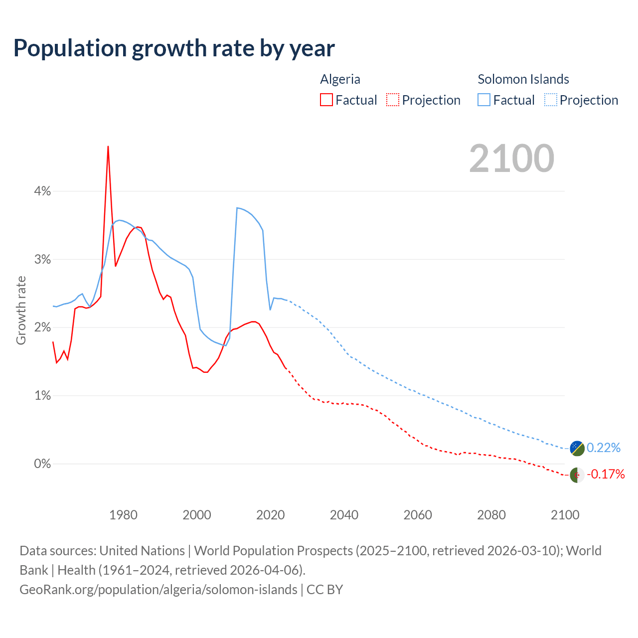 - For the last 10 years, Algeria has had an average growth rate of +1.81% per year vs +2.95% in the Solomon Islands.