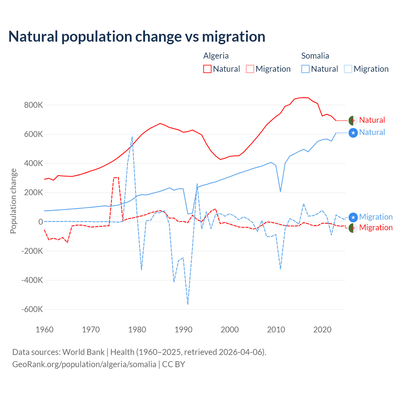 Over the last 10 years, 97.6% of the population change in Algeria is from natural causes (a gain of 7,892,580 people) and 2.42% is from migration (a loss of 195,723 people). In Somalia 94.4% is from natural causes (a gain of 5,270,105 people) and 5.58% is from migration (a gain of 311,487 people).