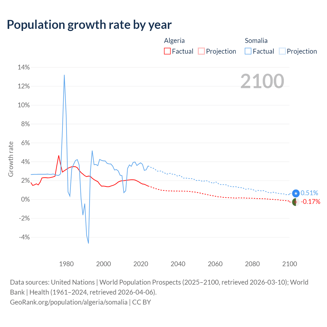 - For the last 10 years, Algeria has had an average growth rate of +1.81% per year vs +3.61% in Somalia.