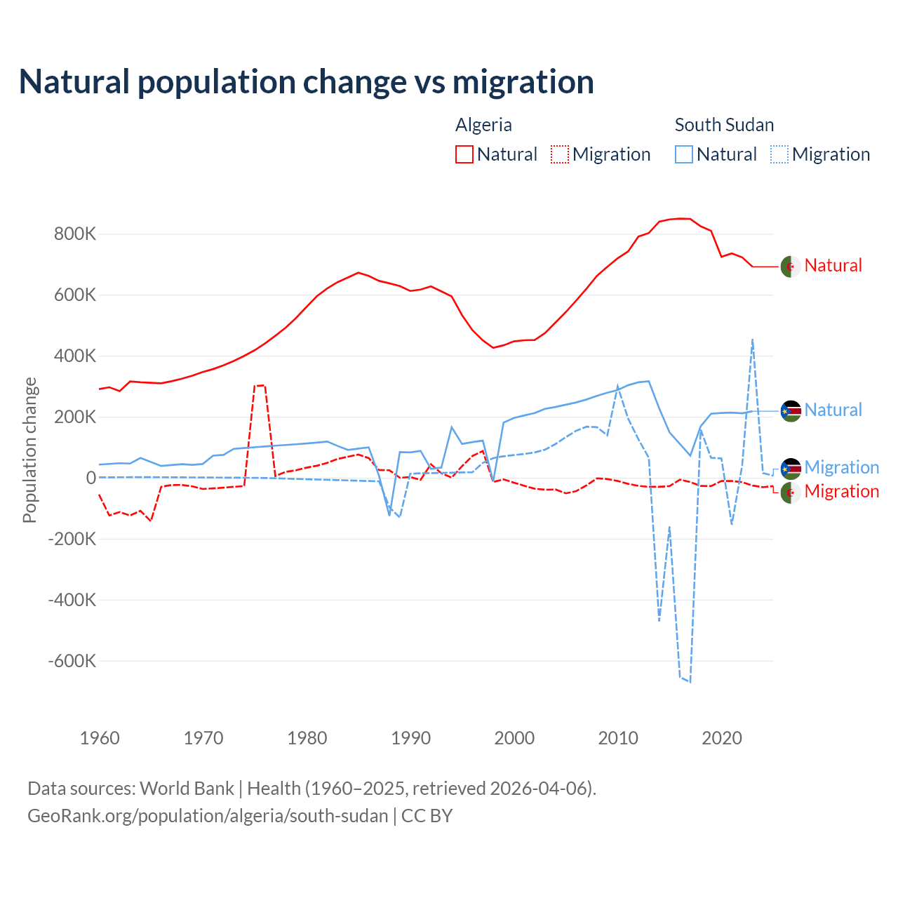 Over the last 10 years, 97.6% of the population change in Algeria is from natural causes (a gain of 7,892,580 people) and 2.42% is from migration (a loss of 195,723 people). In South Sudan 57.4% is from natural causes (a gain of 1,792,135 people) and 42.6% is from migration (a loss of 1,329,606 people).
