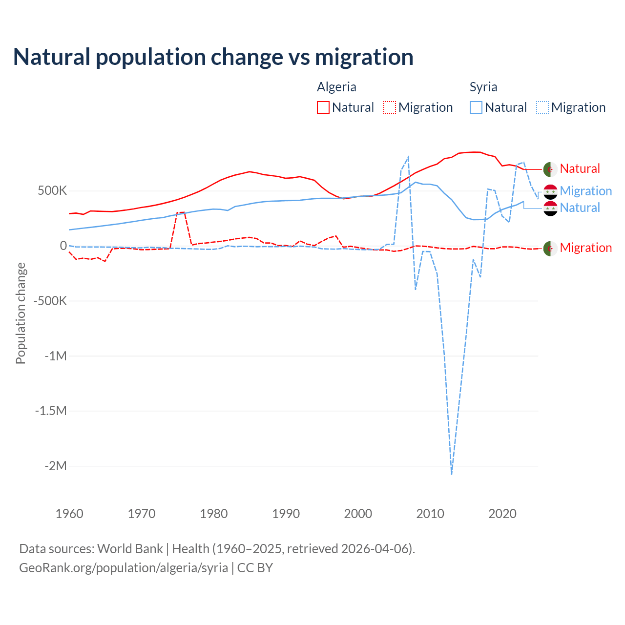 Over the last 10 years, 97.6% of the population change in Algeria is from natural causes (a gain of 7,892,580 people) and 2.42% is from migration (a loss of 195,723 people). In Syria 91.3% is from natural causes (a gain of 3,047,621 people) and 8.72% is from migration (a gain of 291,069 people).