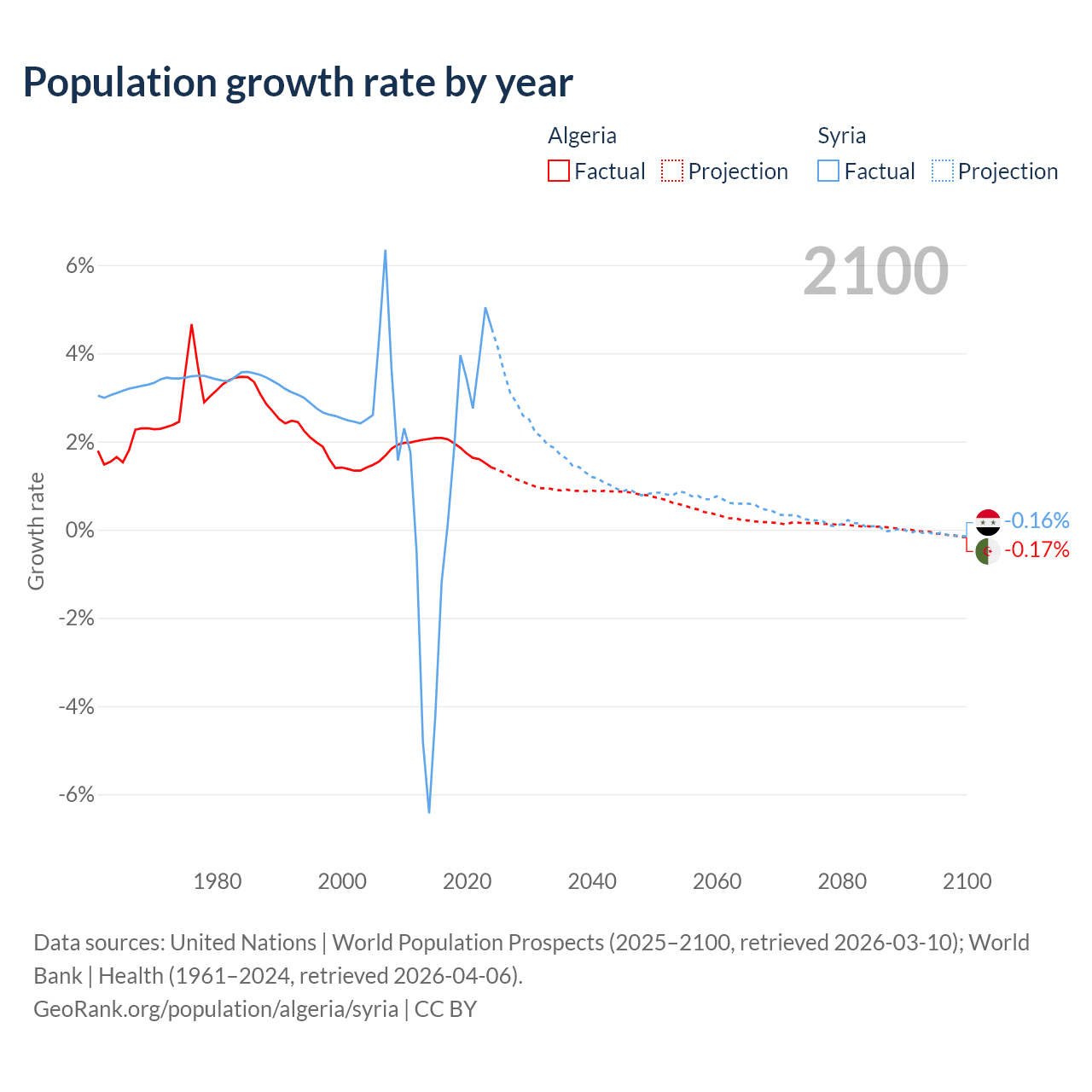 - For the last 10 years, Algeria has had an average growth rate of +1.81% per year vs +1.25% in Syria.