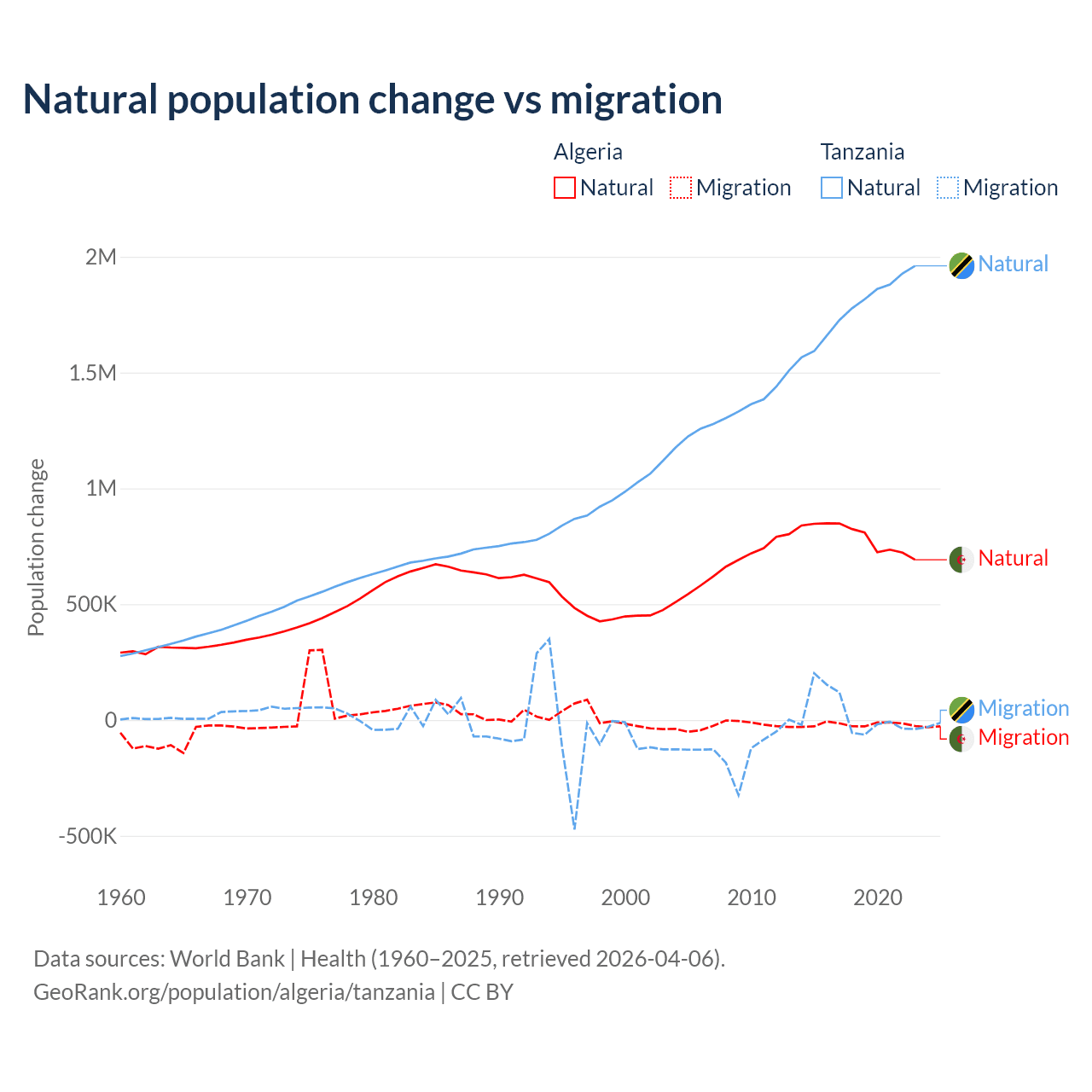 Over the last 10 years, 97.6% of the population change in Algeria is from natural causes (a gain of 7,892,580 people) and 2.42% is from migration (a loss of 195,723 people). In Tanzania 98.7% is from natural causes (a gain of 17,769,541 people) and 1.27% is from migration (a gain of 229,466 people).