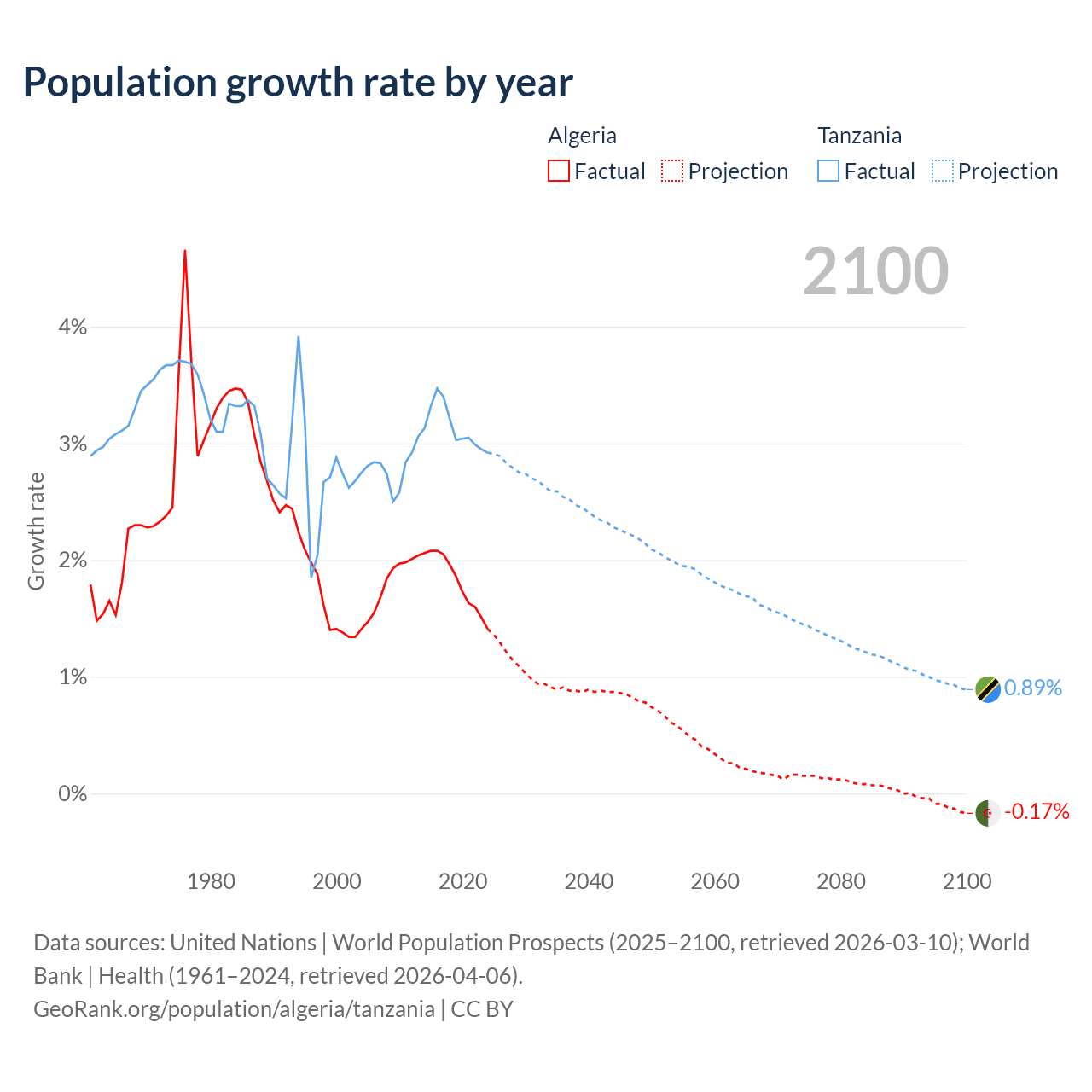 - For the last 10 years, Algeria has had an average growth rate of +1.81% per year vs +3.13% in Tanzania.