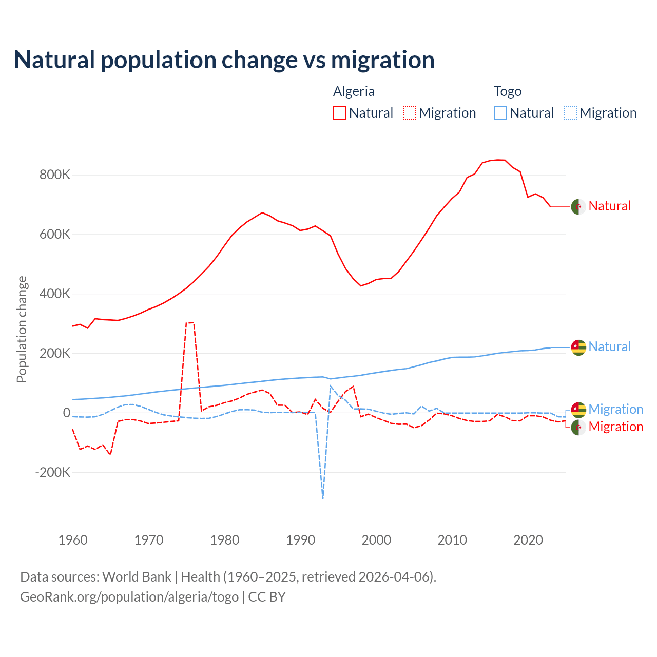 Over the last 10 years, 97.6% of the population change in Algeria is from natural causes (a gain of 7,892,580 people) and 2.42% is from migration (a loss of 195,723 people). In Togo 99.1% is from natural causes (a gain of 2,052,115 people) and 0.86% is from migration (a loss of 17,852 people).