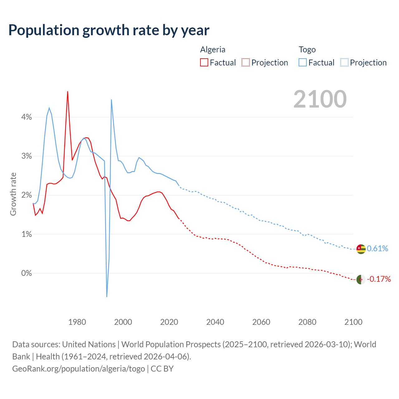 - For the last 10 years, Algeria has had an average growth rate of +1.81% per year vs +2.46% in Togo.