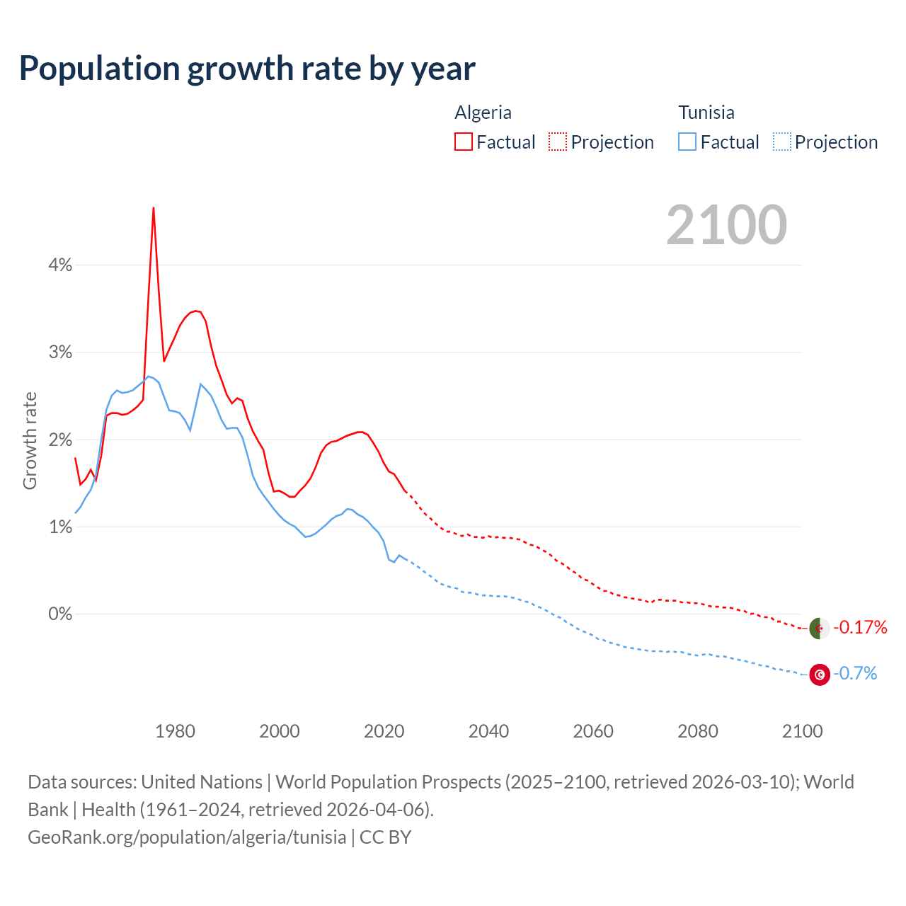 - For the last 10 years, Algeria has had an average growth rate of +1.81% per year vs +0.89% in Tunisia.