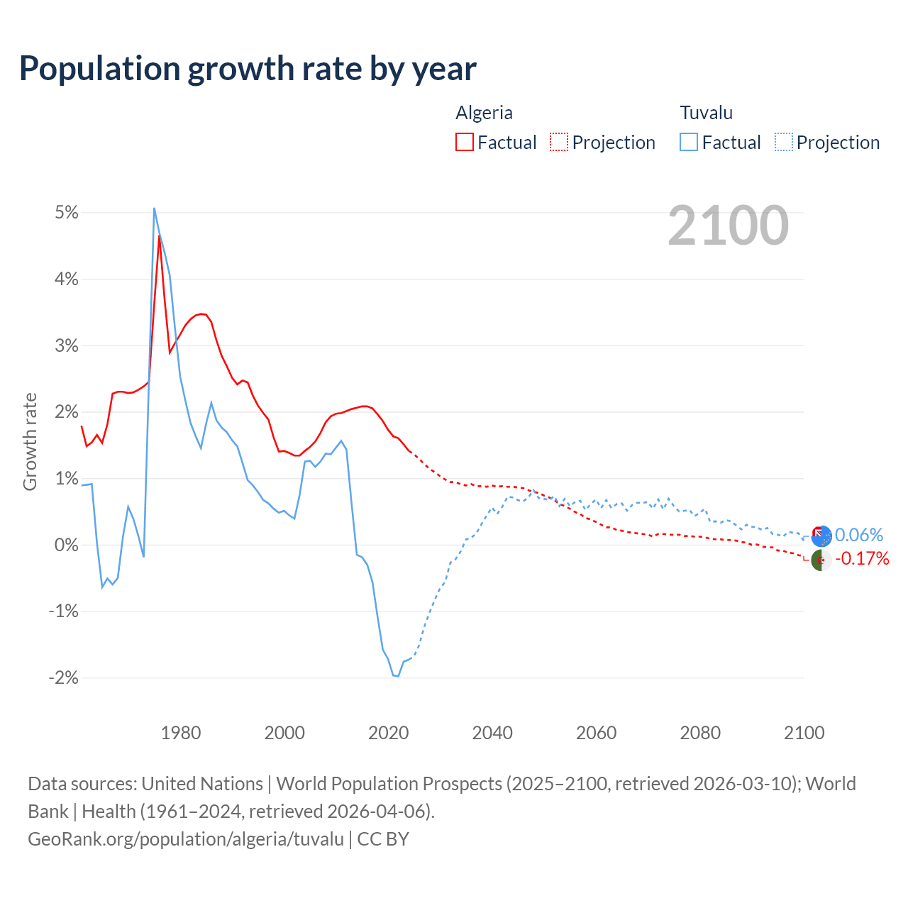 - For the last 10 years, Algeria has had an average growth rate of +1.81% per year vs -1.19% in Tuvalu.