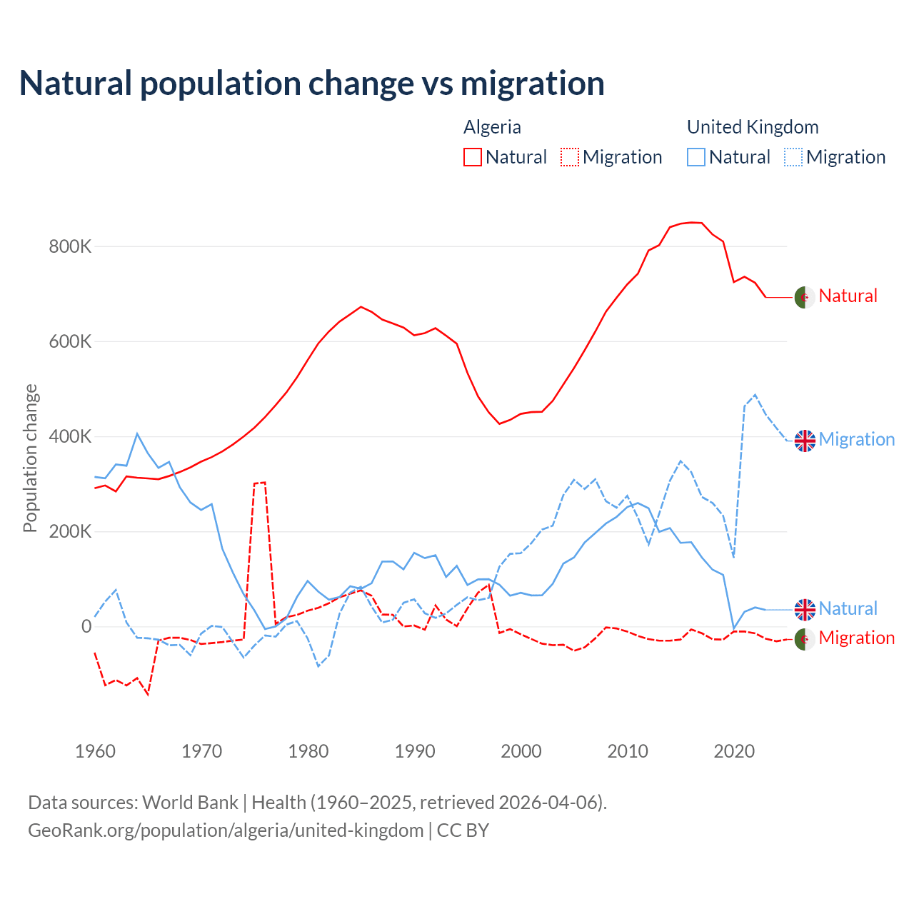 Over the last 10 years, 97.6% of the population change in Algeria is from natural causes (a gain of 7,892,580 people) and 2.42% is from migration (a loss of 195,723 people). In the United Kingdom 23.9% is from natural causes (a gain of 1,033,129 people) and 76.1% is from migration (a gain of 3,283,101 people).