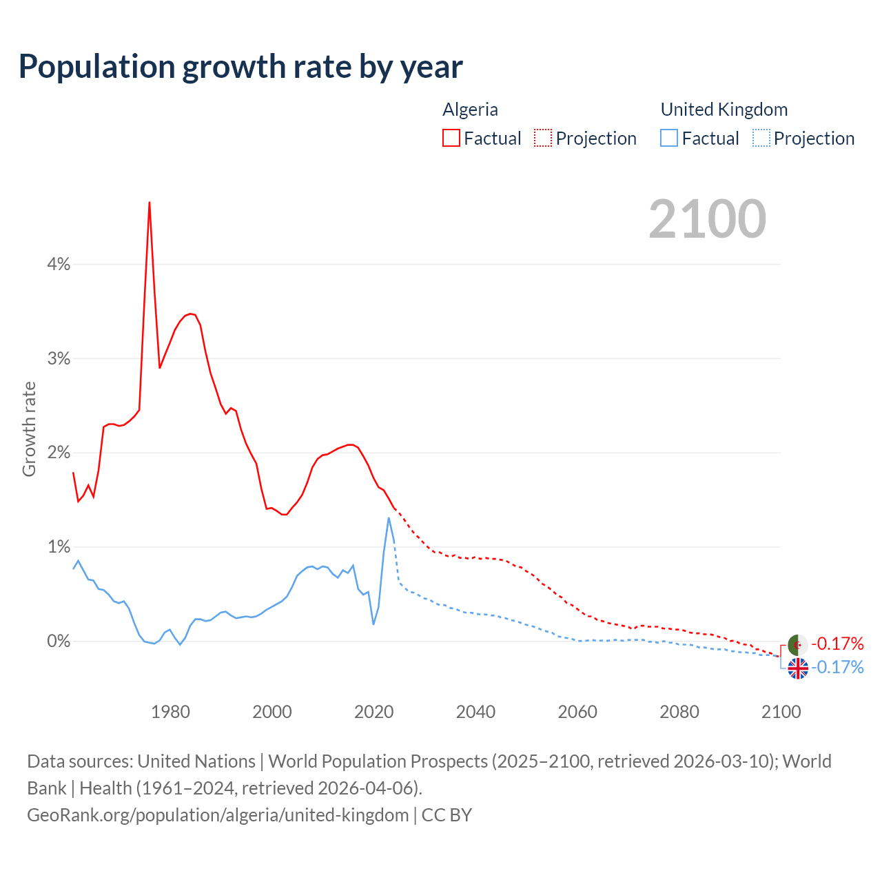 - For the last 10 years, Algeria has had an average growth rate of +1.81% per year vs +0.7% in the United Kingdom.