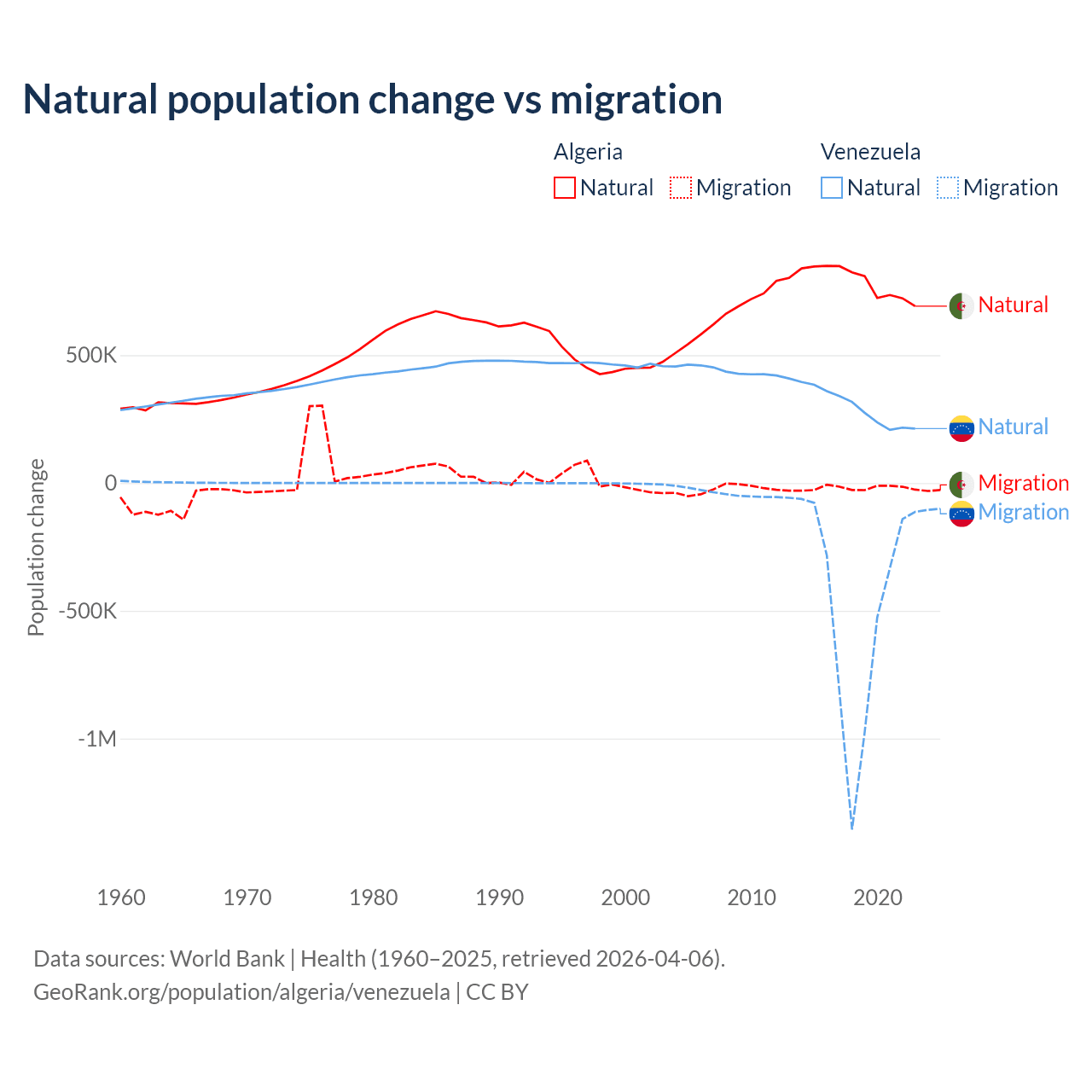Over the last 10 years, 97.6% of the population change in Algeria is from natural causes (a gain of 7,892,580 people) and 2.42% is from migration (a loss of 195,723 people). In Venezuela 38.6% is from natural causes (a gain of 2,946,257 people) and 61.4% is from migration (a loss of 4,683,227 people).