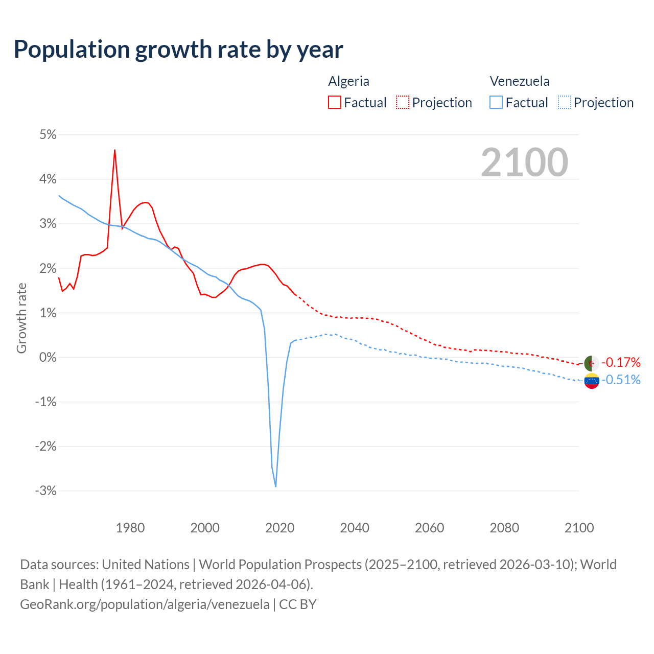 - For the last 10 years, Algeria has had an average growth rate of +1.81% per year vs -0.46% in Venezuela.
