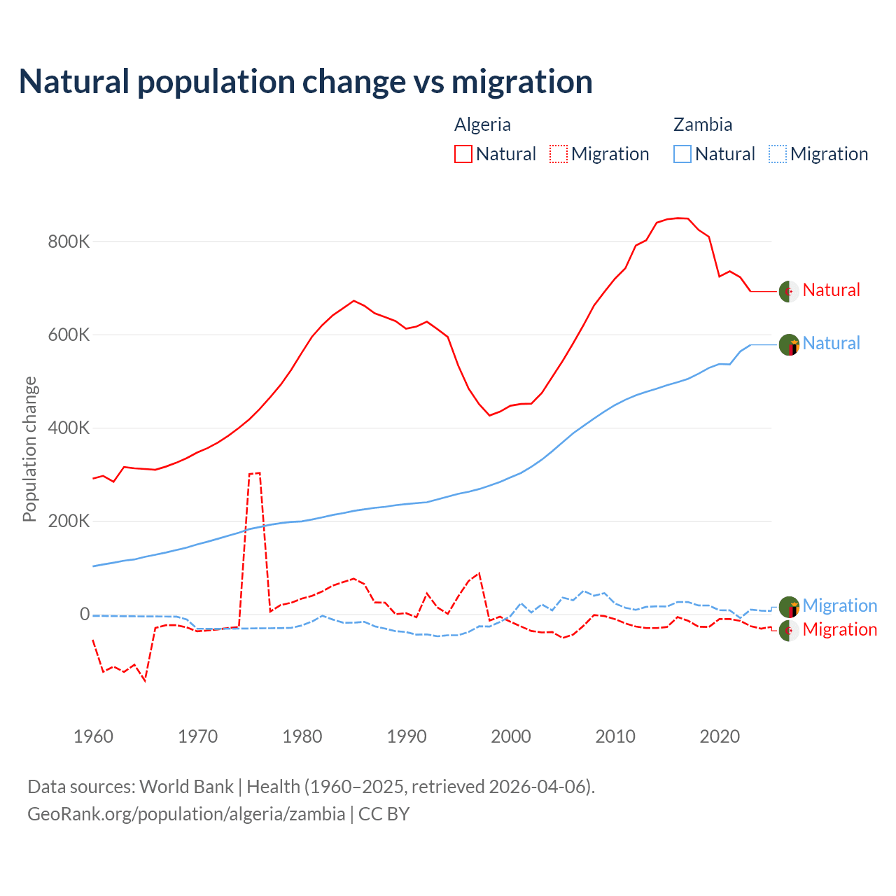 Over the last 10 years, 97.6% of the population change in Algeria is from natural causes (a gain of 7,892,580 people) and 2.42% is from migration (a loss of 195,723 people). In Zambia 97.4% is from natural causes (a gain of 5,233,797 people) and 2.58% is from migration (a gain of 138,554 people).