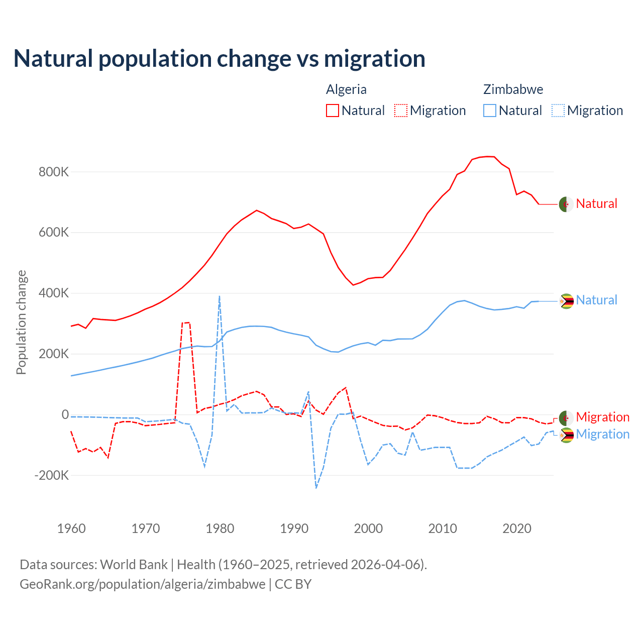 Over the last 10 years, 97.6% of the population change in Algeria is from natural causes (a gain of 7,892,580 people) and 2.42% is from migration (a loss of 195,723 people). In Zimbabwe 74.9% is from natural causes (a gain of 3,558,487 people) and 25.1% is from migration (a loss of 1,192,807 people).