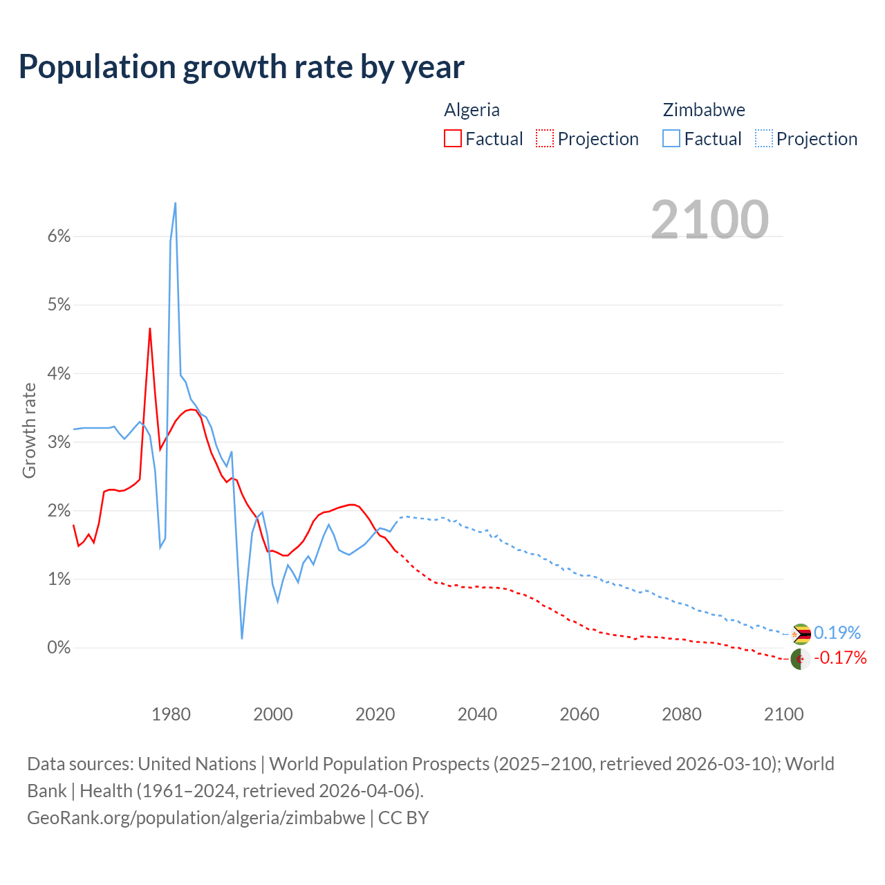 - For the last 10 years, Algeria has had an average growth rate of +1.81% per year vs +1.57% in Zimbabwe.